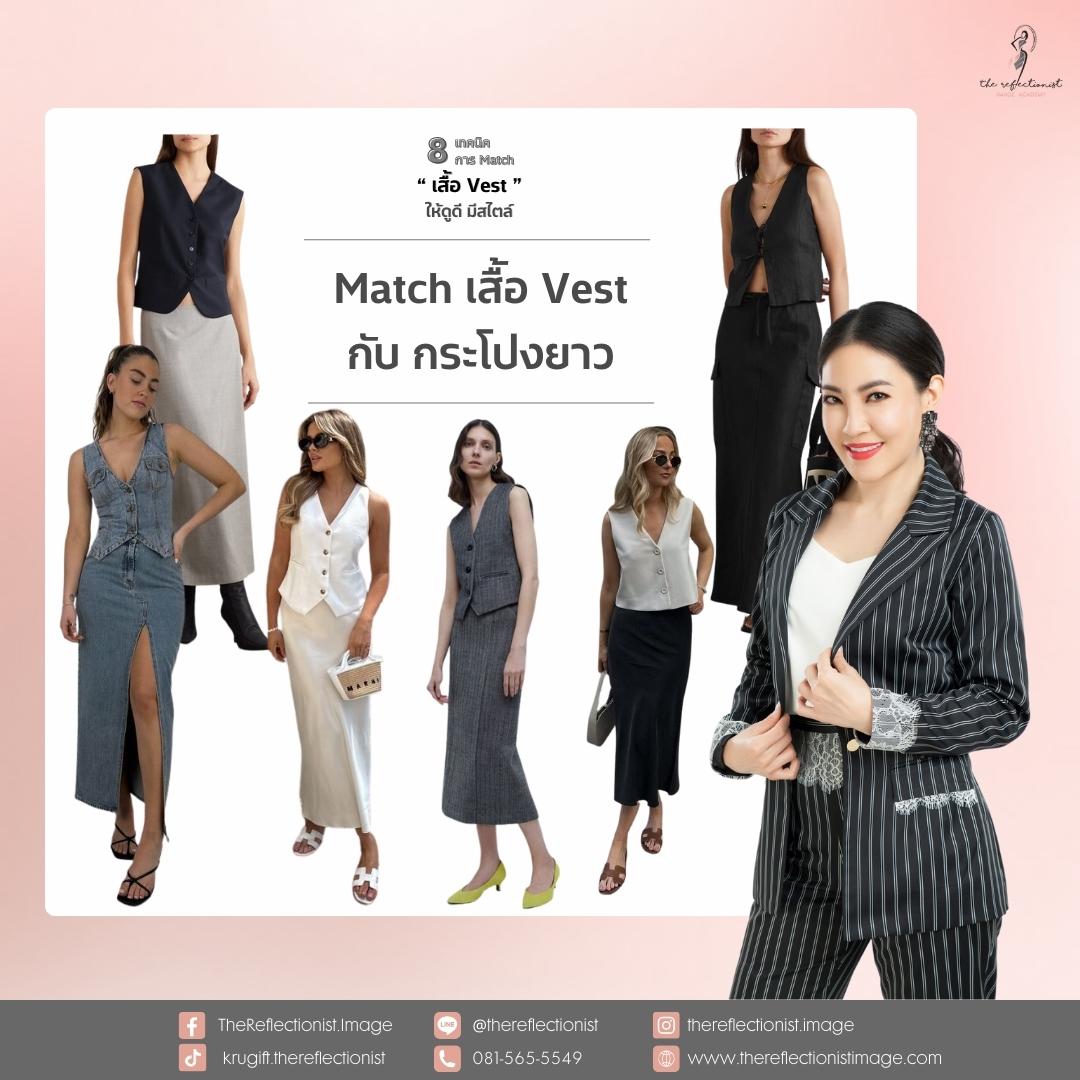 การใส่เสื้อ Vest กับกระโปรงยาวเป็นการ Match look ที่ดูดี มีความเก๋แต่สุภาพ และมีความเป็นทางการมากกว่ากระโปรงสั้น