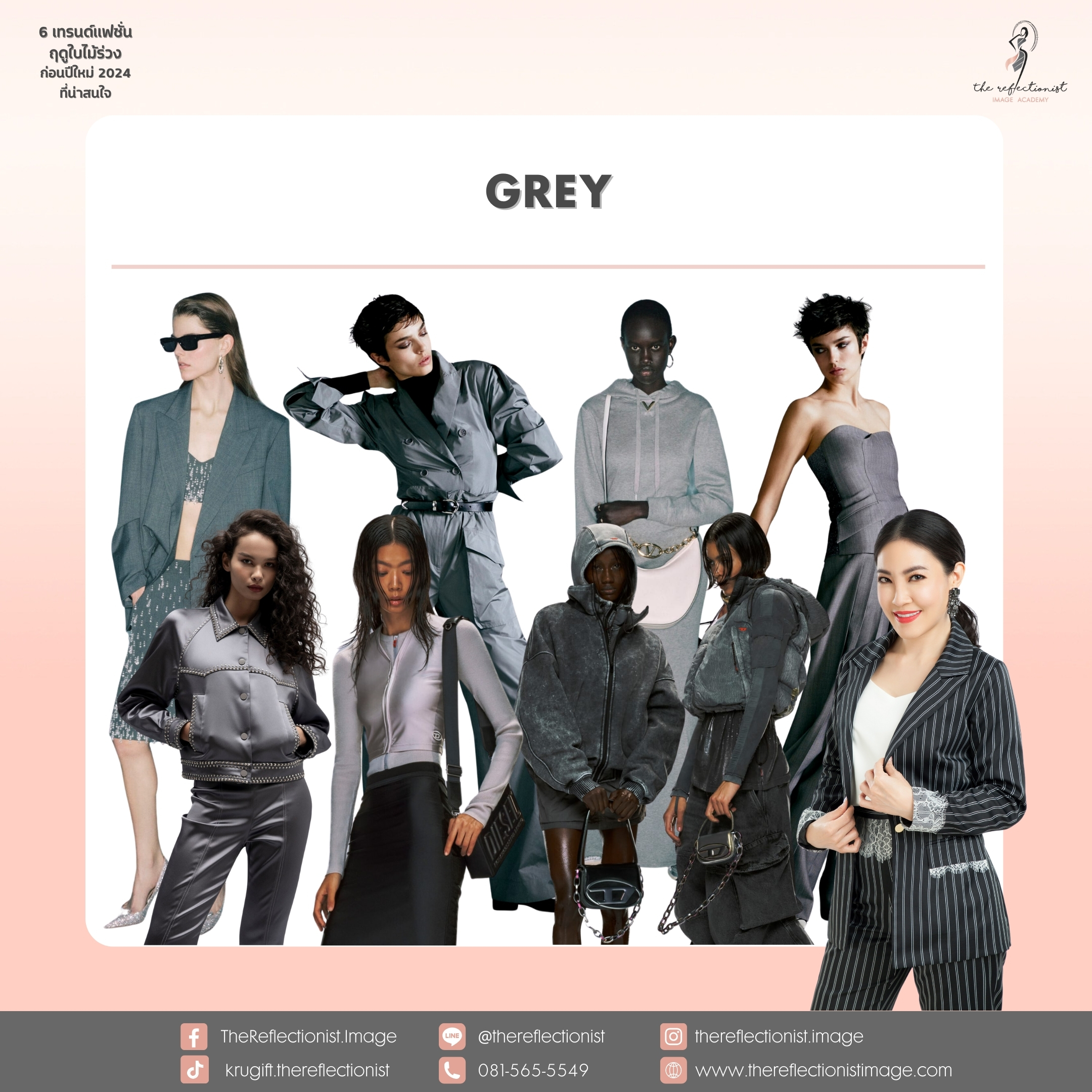 เทรนด์เสื้อผ้าสีเทา เป็นอีกหนึ่งเทรนด์ที่เหมาะกับช่วงสิ้นปีที่มีงานปาร์ตี้ หรืองานสังสรรค์เยอะๆ ยิ่งสีเทาที่มีความเงา เลื่อม ยิ่งสวย โดดเด่นสะดุดตาแน่นอนค่ะ แต่คนที่มีUndertoneผิว Warm Tone แนะนำให้หลีกเลี่ยงเทรนด์นี้ เพราะใส่สีเทาแล้วอาจทำให้คุณดูหมองได้นะคะ