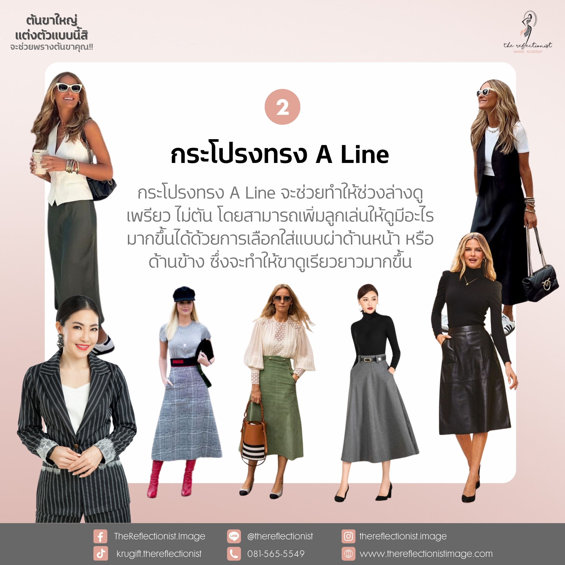 กระโปรงทรง A Line จะช่วยทำให้ช่วงล่างดูเพรียว ไม่ตัน โดยสามารถเพิ่มลูกเล่นให้ดูมีอะไรมากขึ้นได้ด้วยการเลือกใส่แบบผ่าด้านหน้า หรือด้านข้าง ซึ่งจะทำให้ขาดูเรียวยาวมากขึ้น
