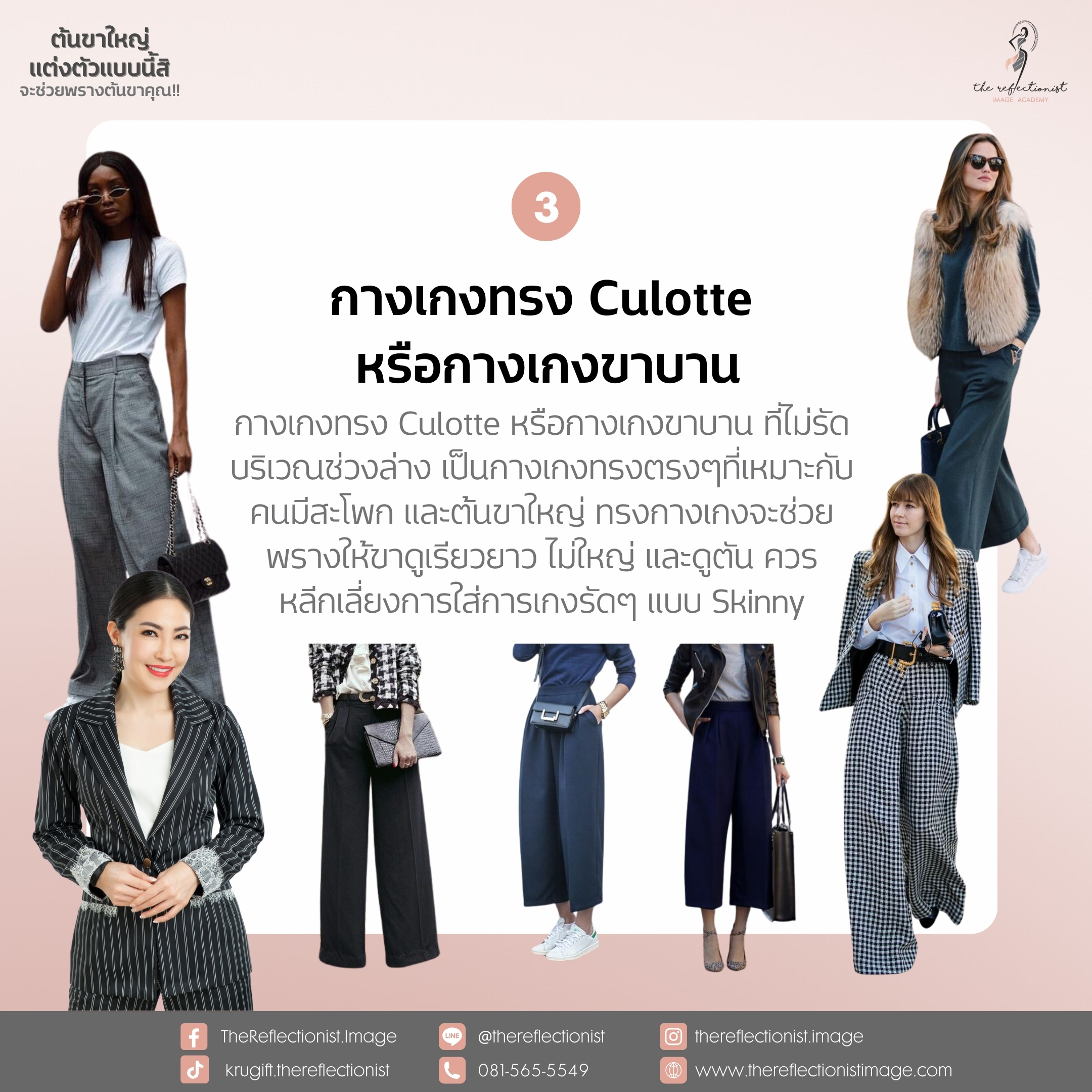 กางเกงทรง Culotte หรือกางเกงขาบาน ที่ไม่รัดบริเวณช่วงล่าง เป็นกางเกงทรงตรงๆที่เหมาะกับคนมีสะโพก และต้นขาใหญ่ ทรงกางเกงจะช่วยพรางให้ขาดูเรียวยาว ไม่ใหญ่ และดูตัน