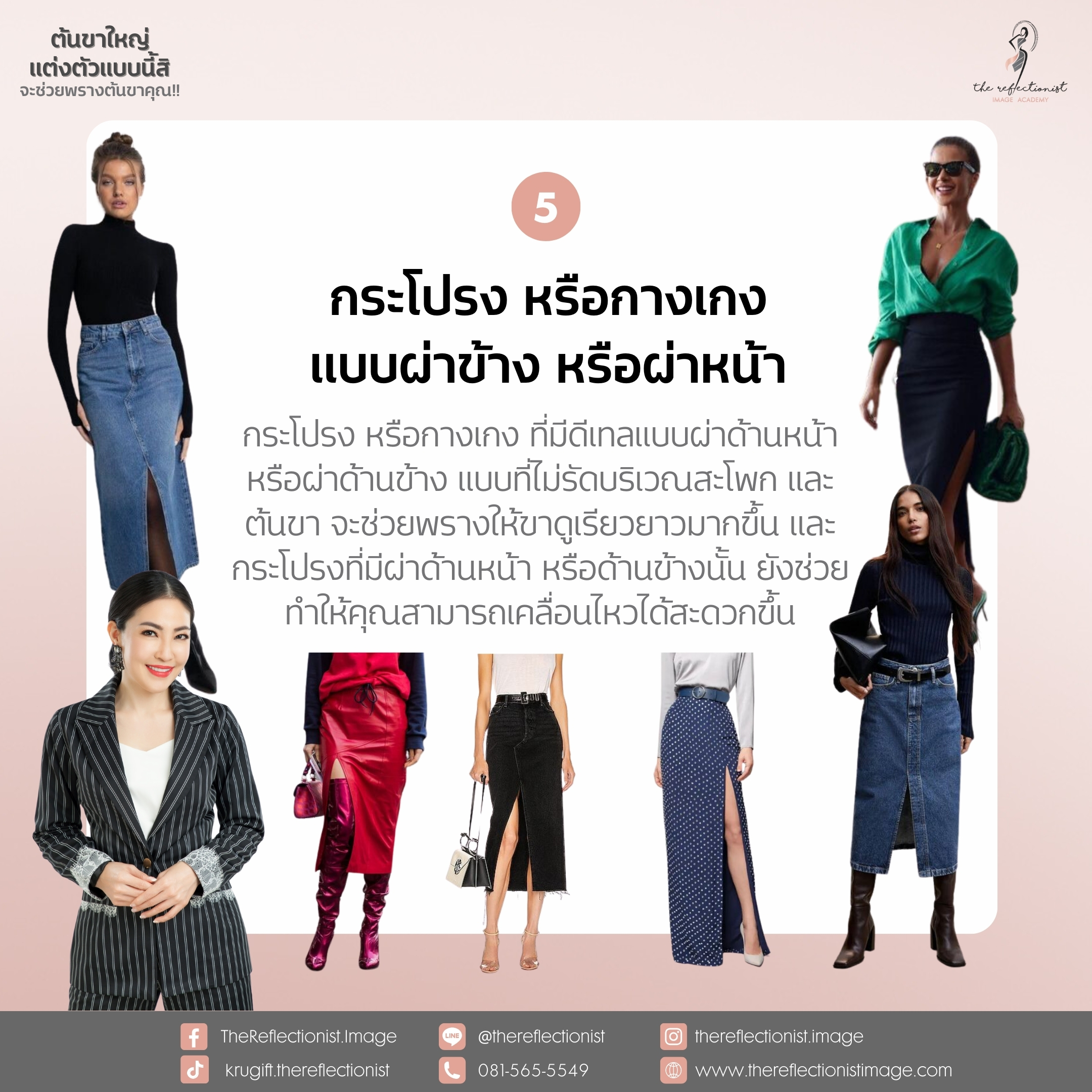กระโปรง หรือกางเกง ที่มีดีเทลแบบผ่าด้านหน้า หรือผ่าด้านข้าง แบบที่ไม่รัดบริเวณสะโพก และต้นขา จะช่วยพรางให้ขาดูเรียวยาวมากขึ้น และกระโปรงที่มีผ่าด้านหน้า หรือด้านข้างนั้น ยังช่วยทำให้คุณสามารถเคลื่อนไหวได้สะดวกขึ้น