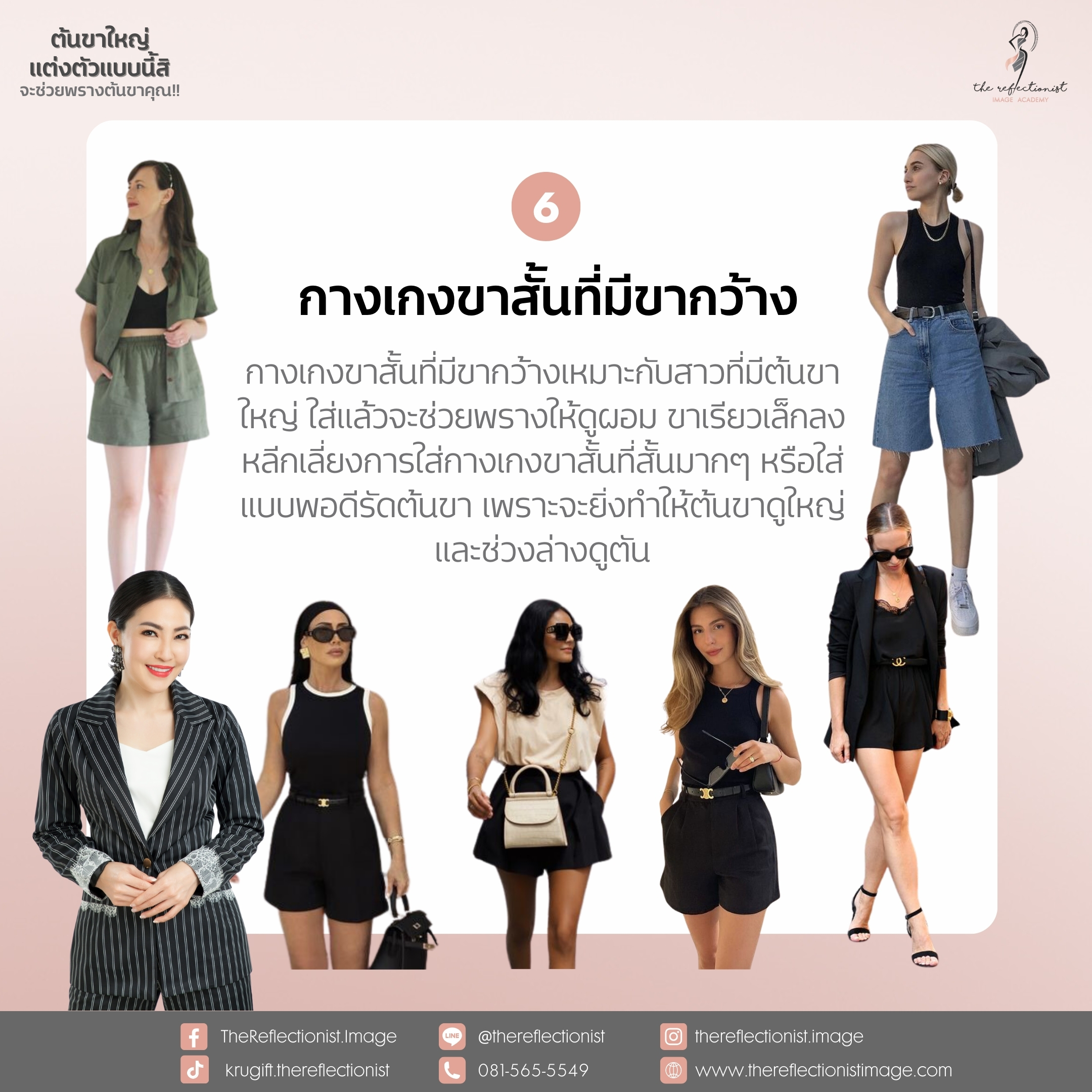 หลีกเลี่ยงการใส่กางเกงขาสั้นที่สั้นมากๆ หรือใส่แบบพอดีรัดต้นขา เพราะจะยิ่งทำให้ต้นขาดูใหญ่ และช่วงล่างดูตัน