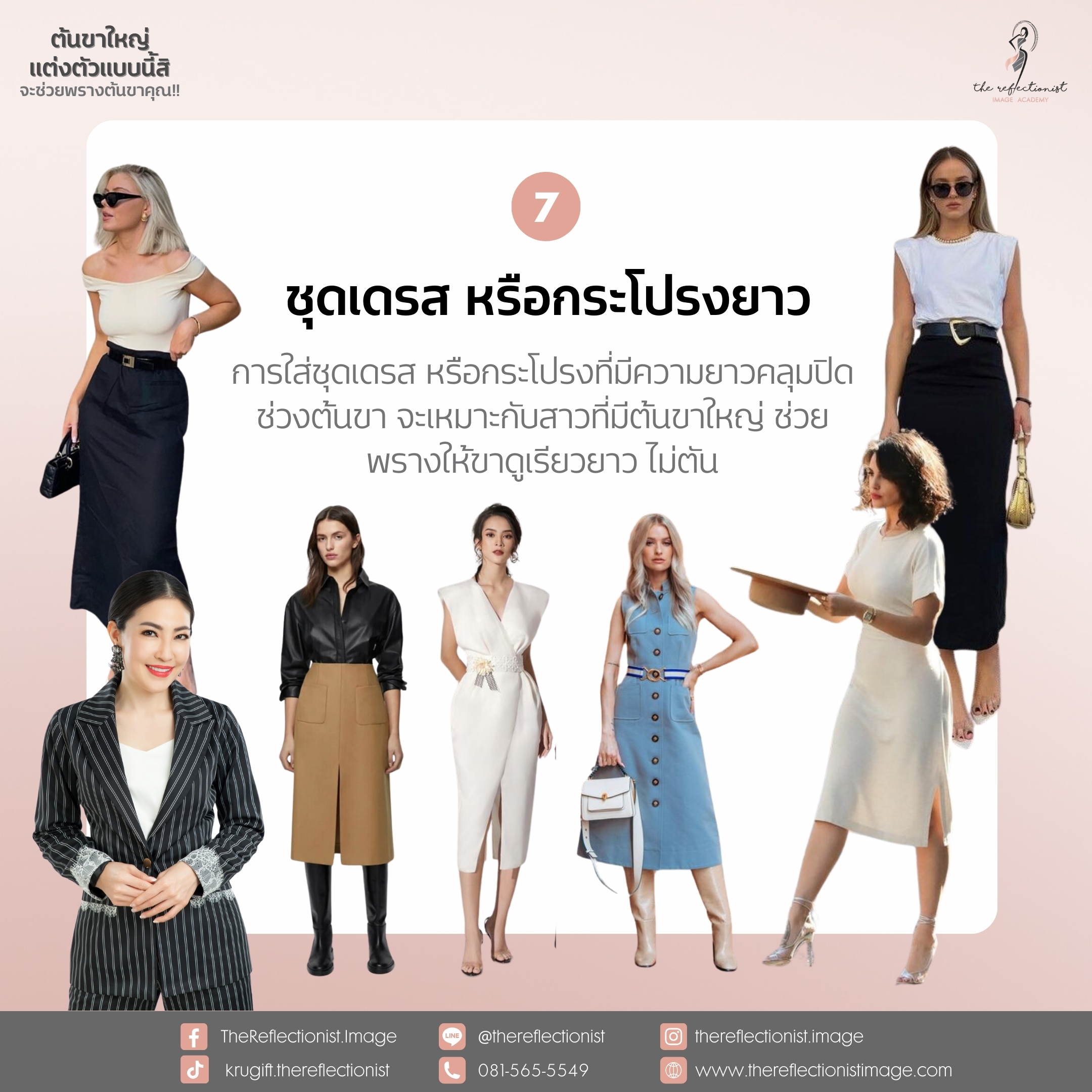 การใส่ชุดเดรส หรือกระโปรงที่มีความยาวคลุมปิดช่วงต้นขา จะเหมาะกับสาวที่มีต้นขาใหญ่ ช่วยพรางให้ขาดูเรียวยาว ไม่ตัน
