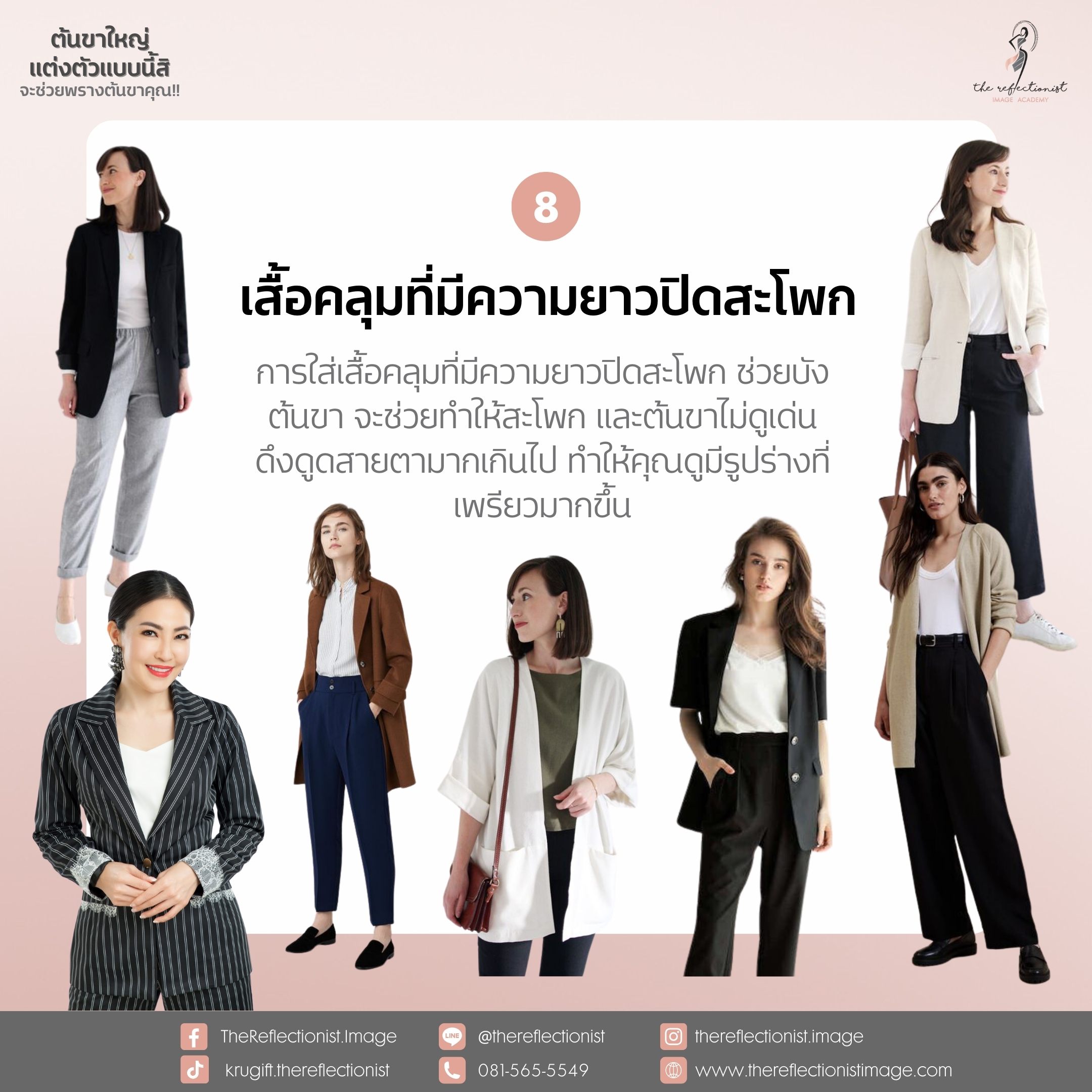การใส่เสื้อคลุมที่มีความยาวปิดสะโพก ช่วยบังต้นขา จะช่วยทำให้สะโพก และต้นขาไม่ดูเด่น ดึงดูดสายตามากเกินไป ทำให้คุณดูมีรูปร่างที่เพรียวมากขึ้น