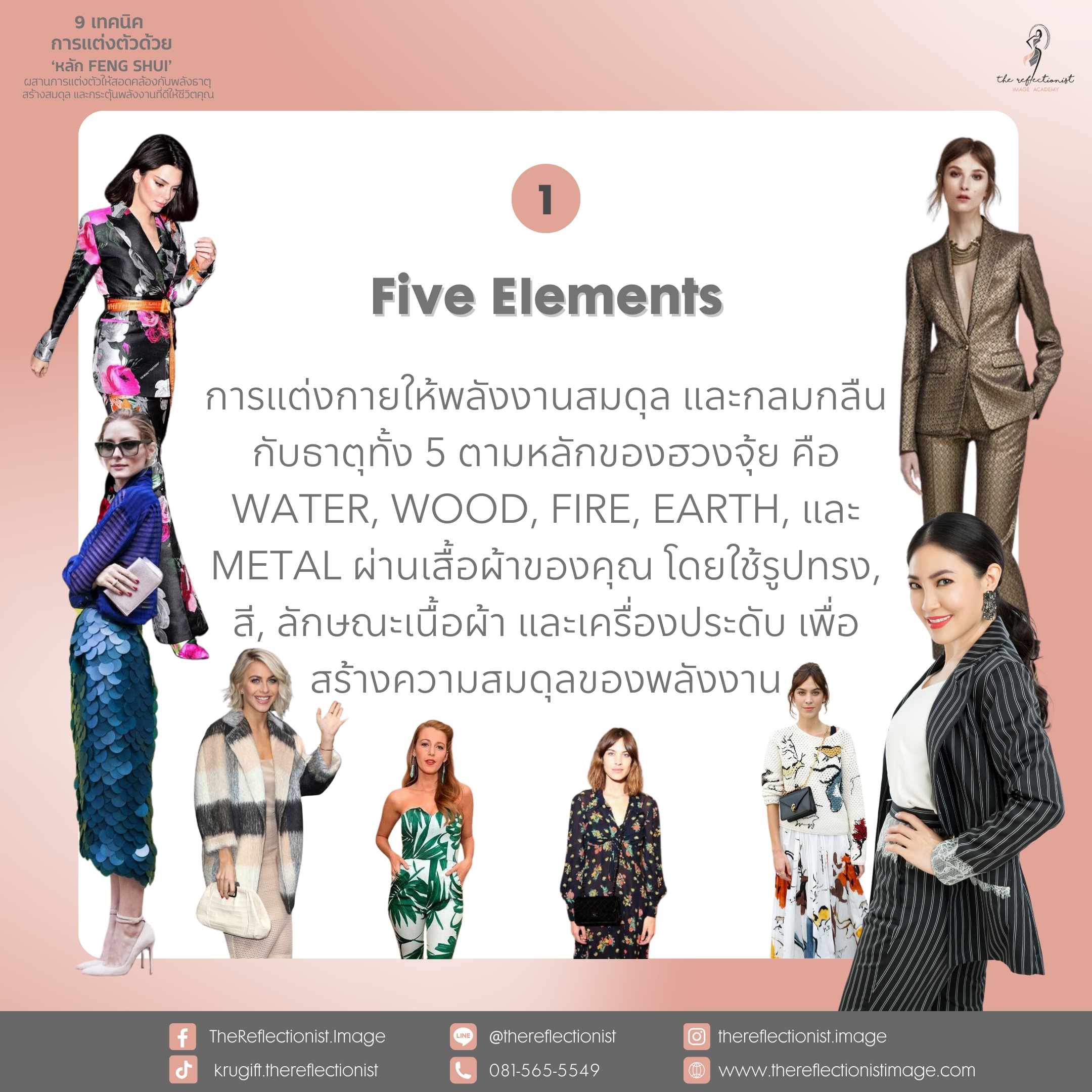 และถ้าใครสนใจ และอยากเรียนรู้เกี่ยวกับ Fashion Feng Shui มากขึ้น ว่าตัวคุณเองนั้นมีสไตล์การแต่งตัวสอดคล้องกับธาตุอย่างไร และเทคนิคการปรับการแต่งตัวให้สอดคล้อง สมดุล อย่างเป็นธรรมชาติ เพื่อเพิ่มพลังงานที่ดีสร้างความสุข ความสำเร็จให้กับชีวิต