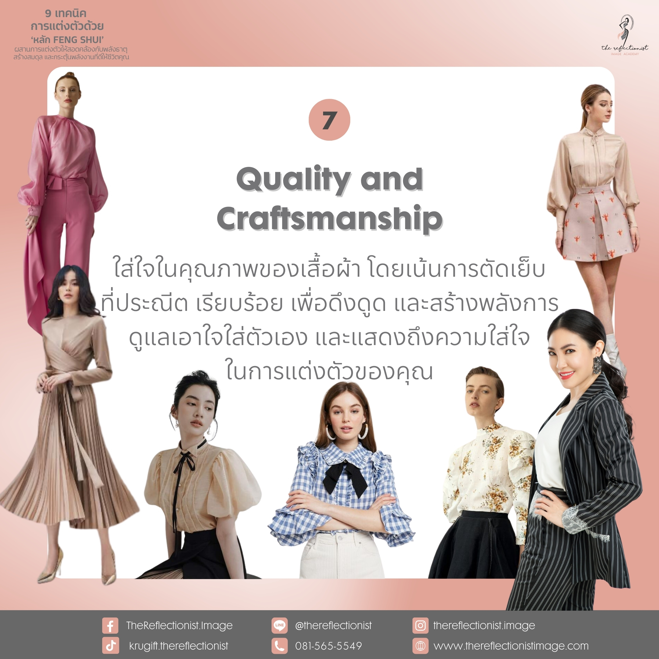 ใส่ใจในคุณภาพของเสื้อผ้า โดยเน้นการตัดเย็บที่ประณีต เรียบร้อย เพื่อดึงดูด และสร้างพลังการดูแลเอาใจใส่ตัวเอง และแสดงถึงความใส่ใจในการแต่งตัวของคุณ