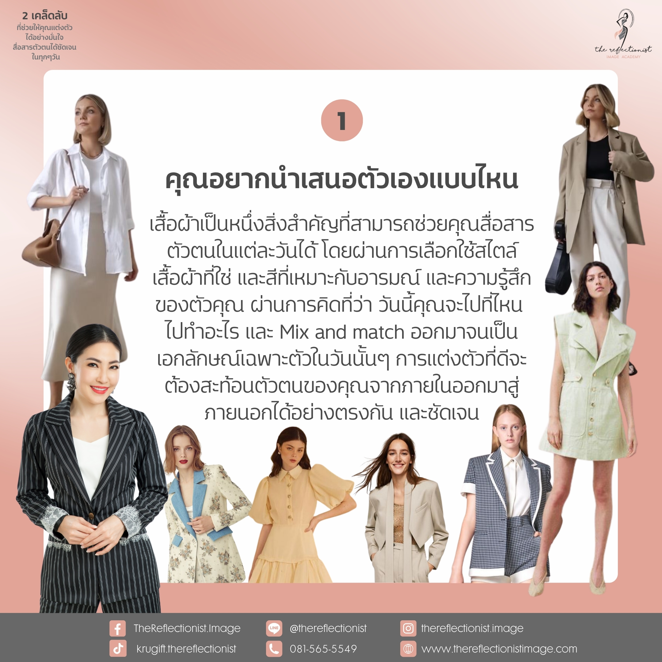 เสื้อผ้าเป็นหนึ่งสิ่งสำคัญที่สามารถช่วยคุณสื่อสารตัวตนในแต่ละวันได้ โดยผ่านการเลือกใช้สไตล์เสื้อผ้าที่ใช่ และสีที่เหมาะกับอารมณ์ และความรู้สึกของตัวคุณ ผ่านการคิดที่ว่า วันนี้คุณจะไปที่ไหน ไปทำอะไร และ Mix and match ออกมาจนเป็นเอกลักษณ์เฉพาะตัวในวันนั้นๆ การแต่งตัวที่ดีจะต้องสะท้อนตัวตนของคุณจากภายในออกมาจนเป็นเอกลักษณ์เฉพาะตัวในวันนั้นๆ การแต่งตัวที่ดีจะต้องสะท้อนตัวตนของคุณจากภายในออกมาสู่ภายนอกได้อย่างตรงกัน และชัดเจน
