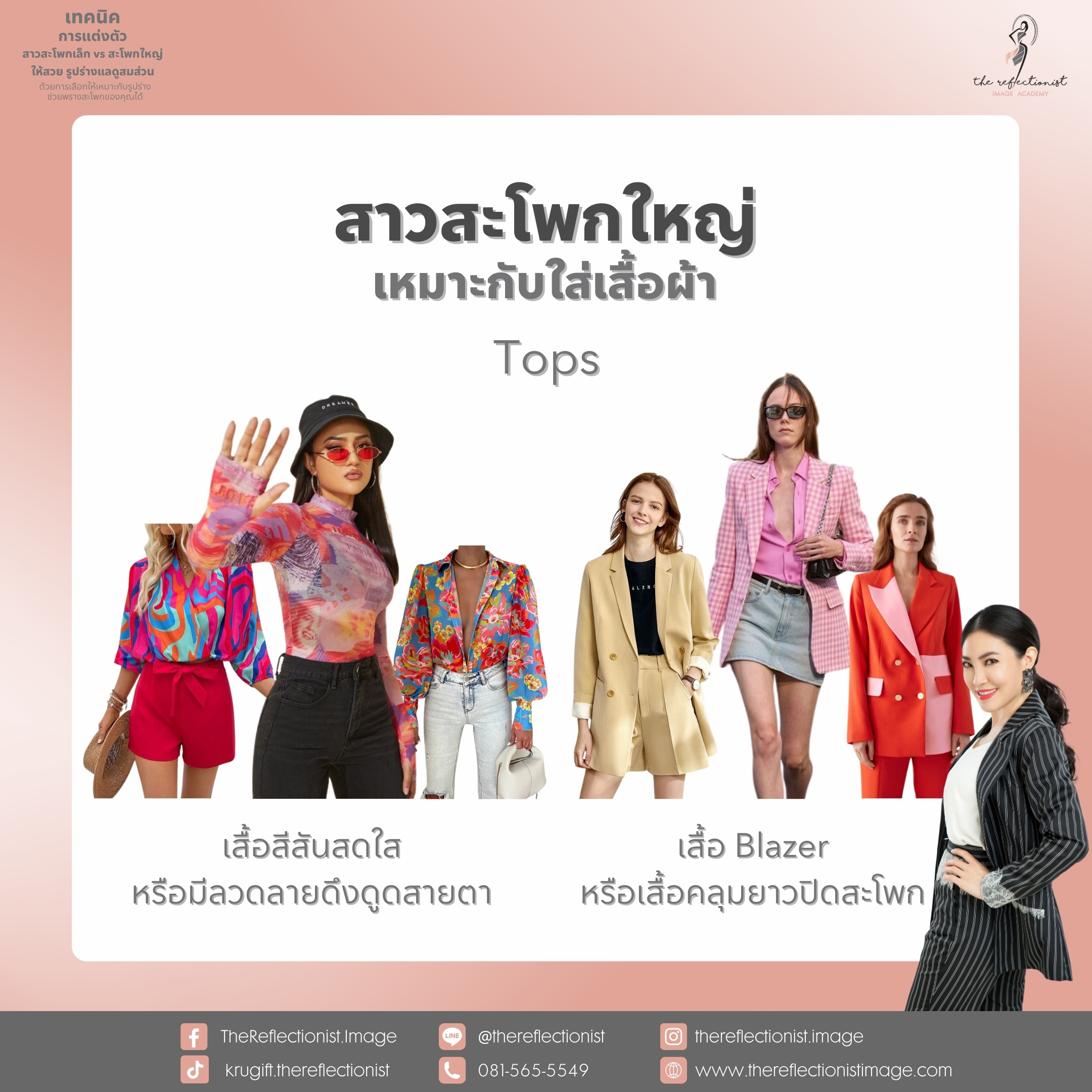สำหรับสาวสะโพกใหญ่ หลายๆคนค่อนข้างที่จะไม่มั่นใจในสะโพก และต้นขา ดังนั้นเสื้อผ้าที่คุณควรเลือกใส่คือ เสื้อที่เน้นดีเทลช่วงบน ไม่ว่าจะเป็นการเลือกใส่สีสันที่สดใส หรือมีสีฉูดฉาก หรือมีดีเทลลวดลาย ที่ดึงดูสายตาคนให้มอง และเสื้อคลุมตัวยาวที่ยาวปิดสะโพกลงมา พรางไม่ให้สะโพกดูใหญ่