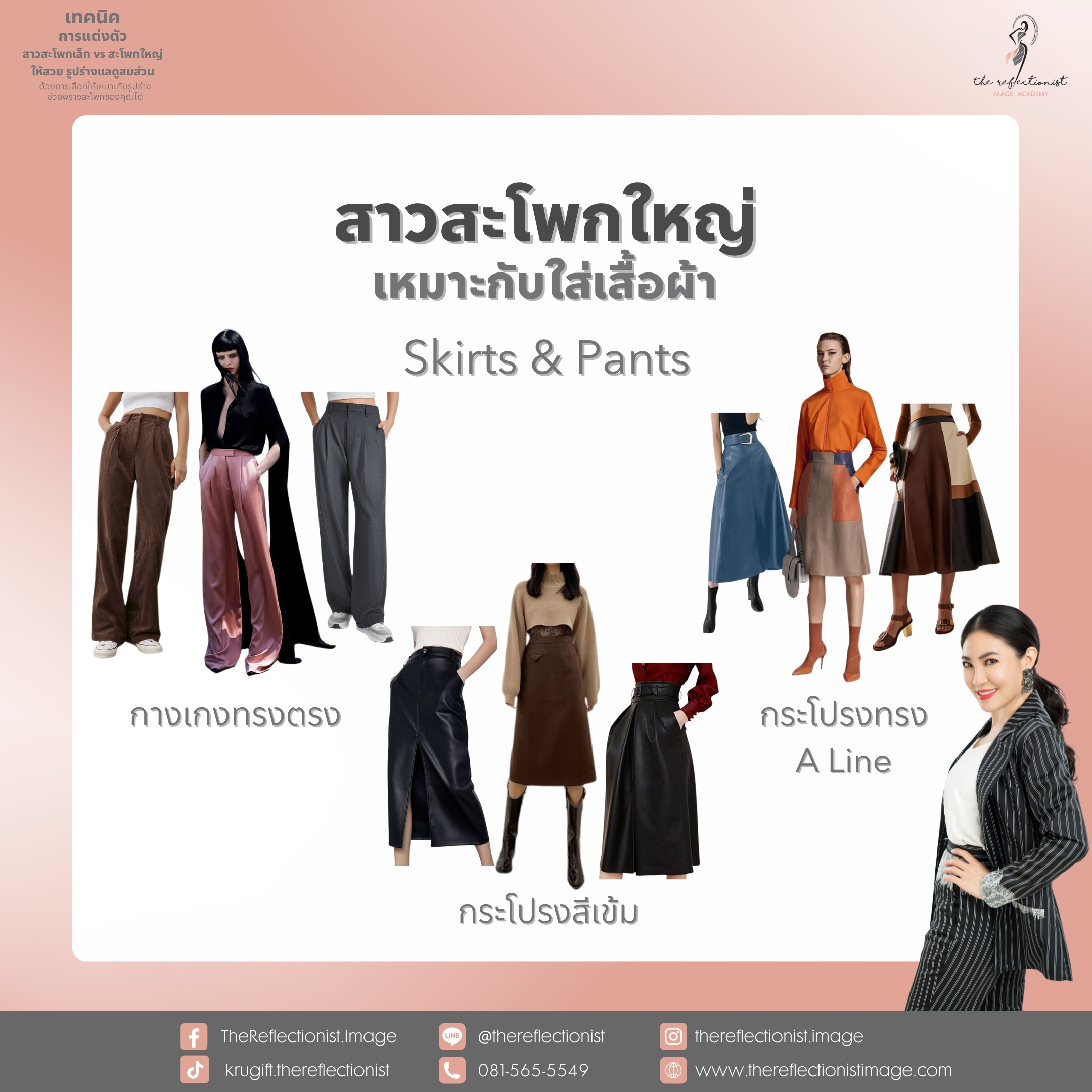 และช่วงล่างที่สาวสะโพกใหญ่ใส่ได้ดีก็คือ กางเกงทรงตรงๆพอดีตัว ไม่รัด หรือมีดีเทลช่วงสะโพกให้เป็นจุดโฟกัส กก.ทรงFlare จะช่วยพรางให้สะโพก ต้นขาดูเล็กลง และดูช่วงตัวยาวมากขึ้น