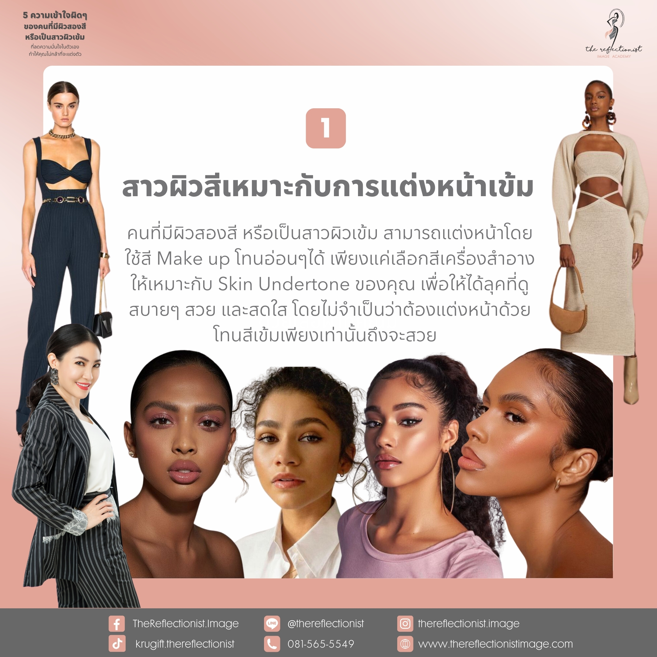 คนที่มีผิวสองสี หรือเป็นสาวผิวเข้ม สามารถแต่งหน้าโดยใช้สี Make up โทนอ่อนๆได้ เพียงแค่เลือกสีเครื่องสำอางให้เหมาะกับ Skin Undertone ของคุณ เพื่อให้ได้ลุคที่ดูสบายๆ สวย และสดใส โดยไม่จำเป็นว่าต้องแต่งหน้าด้วยโทนสีเข้มเพียงเท่านั้นถึงจะสวย