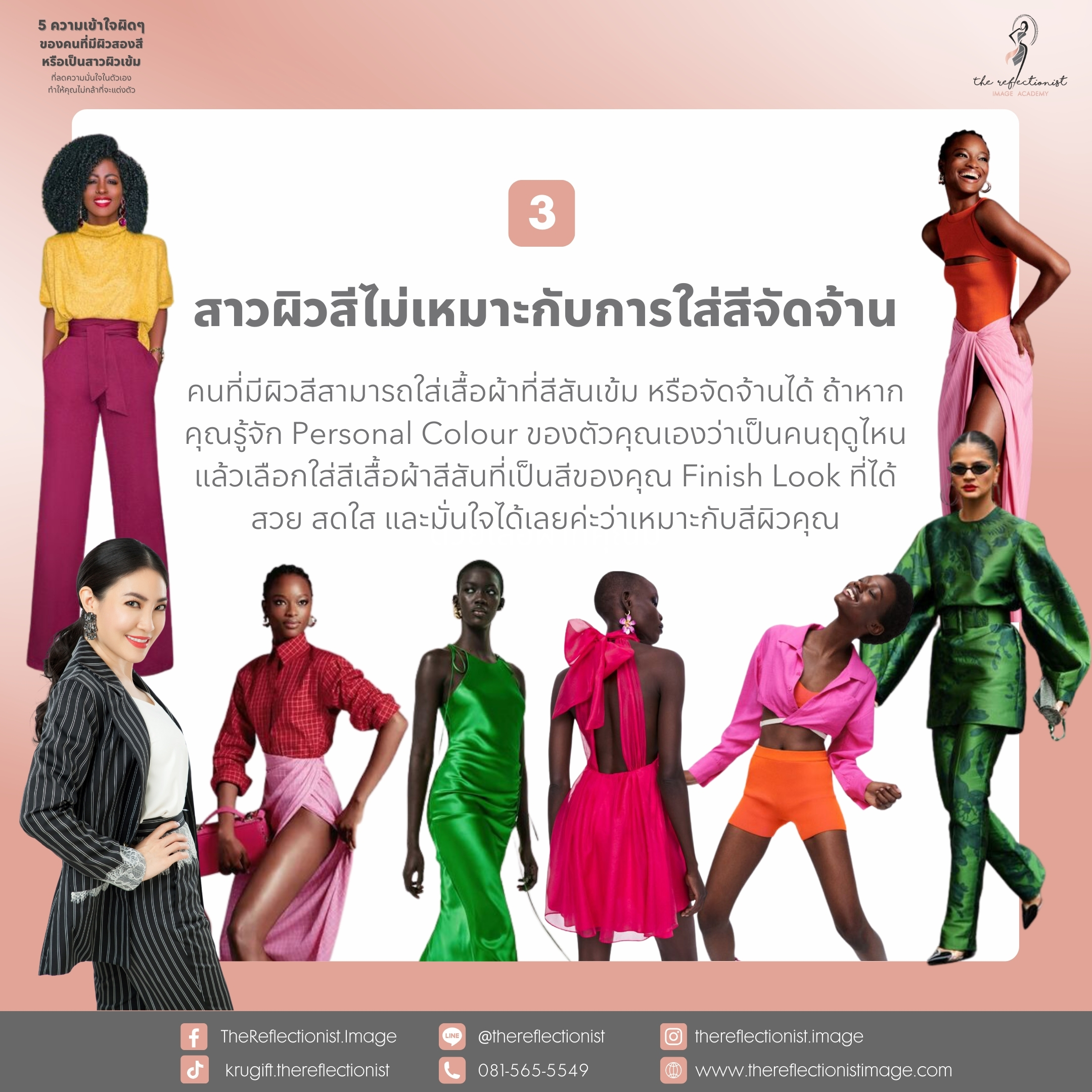 คนที่มีผิวสีสามารถใส่เสื้อผ้าที่สีสันเข้ม หรือจัดจ้านได้ ถ้าหากคุณรู้จัก Personal Colour ของตัวคุณเองว่าเป็นคนฤดูไหน แล้วเลือกใส่สีเสื้อผ้าสีสันที่เป็นสีของคุณ Finish Look ที่ได้สวย สดใส และมั่นใจได้เลยค่ะว่าเหมาะกับสีผิวคุณ
