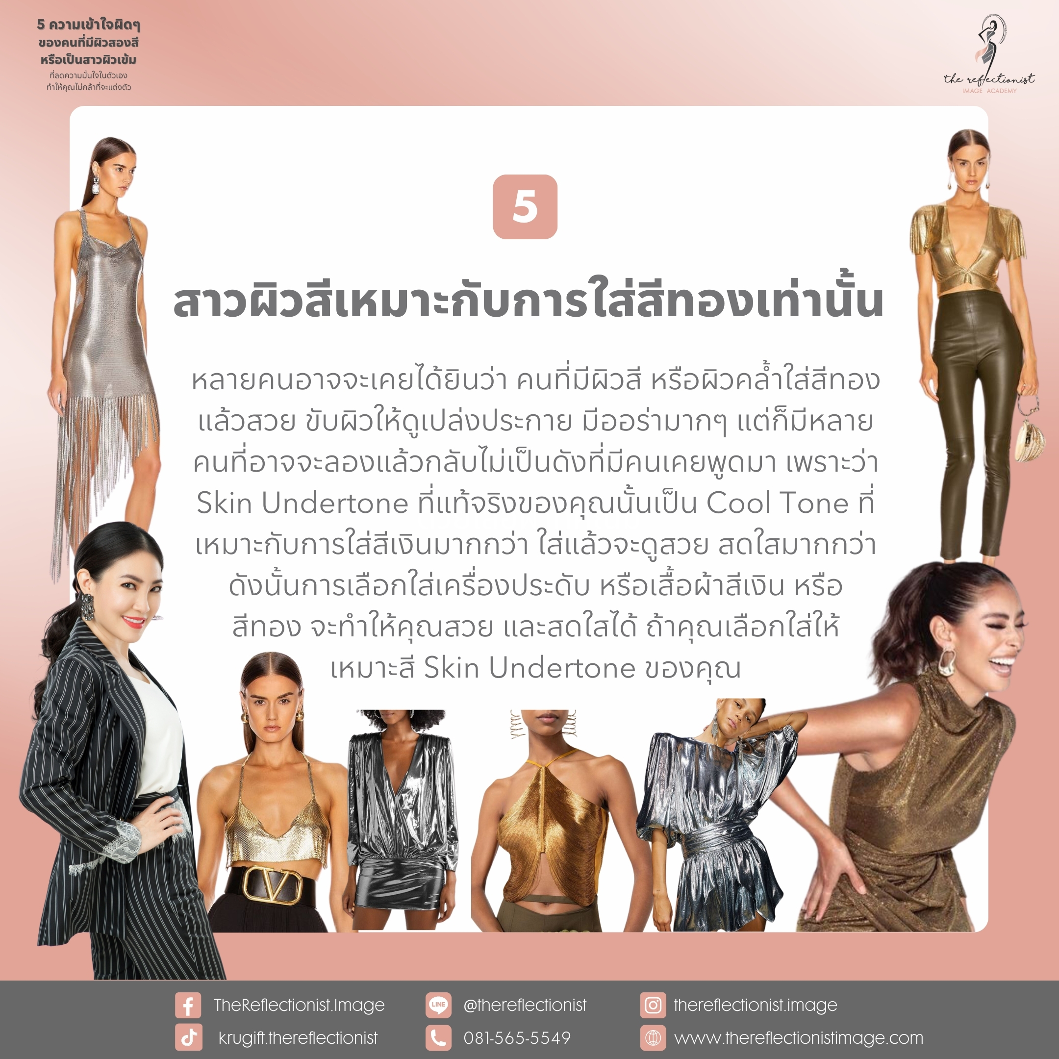 หลายคนอาจจะเคยได้ยินว่า คนที่มีผิวสี หรือผิวคล้ำใส่สีทองแล้วสวย ขับผิวให้ดูเปล่งประกาย มีออร่ามากๆ แต่ก็มีหลายคนที่อาจจะลองแล้วกลับไม่เป็นดังที่มีคนเคยพูดมา เพราะว่า Skin Undertone ที่แท้จริงของคุณนั้นเป็น Cool Tone ที่เหมาะกับการใส่สีเงินมากกว่า ใส่แล้วจะดูสวย สดใสมากกว่า ดังนั้นการเลือกใส่เครื่องประดับ หรือเสื้อผ้าสีเงิน หรือสีทอง จะทำให้คุณสวย และสดใสได้ ถ้าคุณเลือกใส่ให้เหมาะสี Skin Undertone ของคุณ