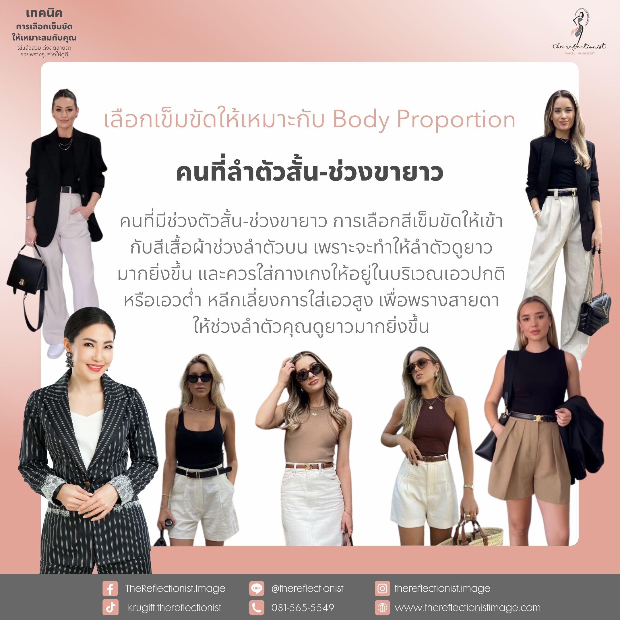 คนที่มีช่วงตัวยาว-ช่วงขาสั้น การทำให้ช่วงขาดูยาวมากยิ่งขึ้นนอกจากการใส่กางเกงเอวสูงแล้ว การเลือกสีเข็มขัดให้เข้ากับกางเกง หรือเป็นโทนสีเดียวกับกางเกงจะยิ่งช่วยทำให้ช่วงขาของคุณยาวมากยิ่งขึ้น ช่วงพรางรูปร่างให้ได้สดส่วนที่ดูดีกว่าเดิม