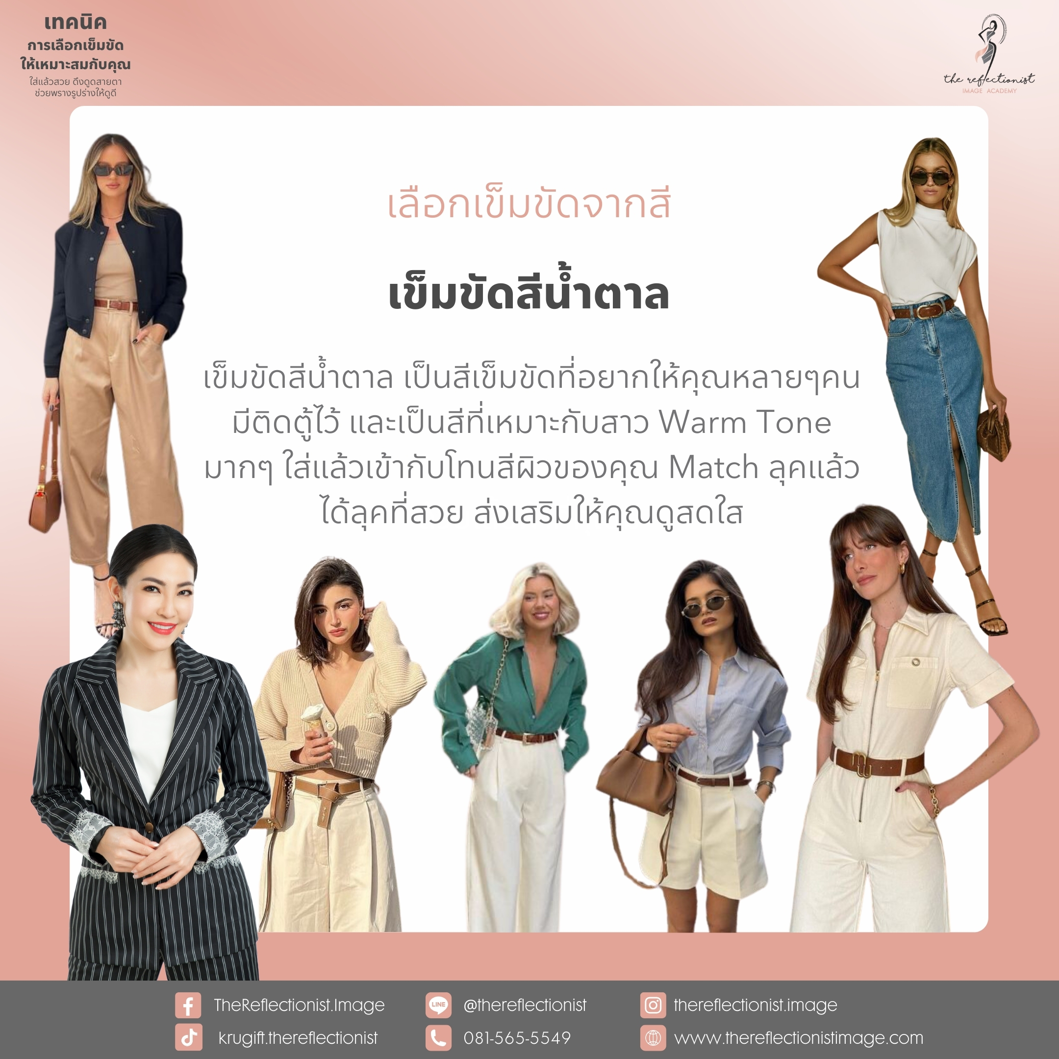 เข็มขัดสีน้ำตาล เป็นสีเข็มขัดที่อยากให้คุณหลายๆคนมีติดตู้ไว้ และเป็นสีที่เหมาะกับสาว Warm Tone มากๆ ใส่แล้วเข้ากับโทนสีผิวของคุณ Match ลุคแล้วได้ลุคที่สวย ส่งเสริมให้คุณดูสดใส
