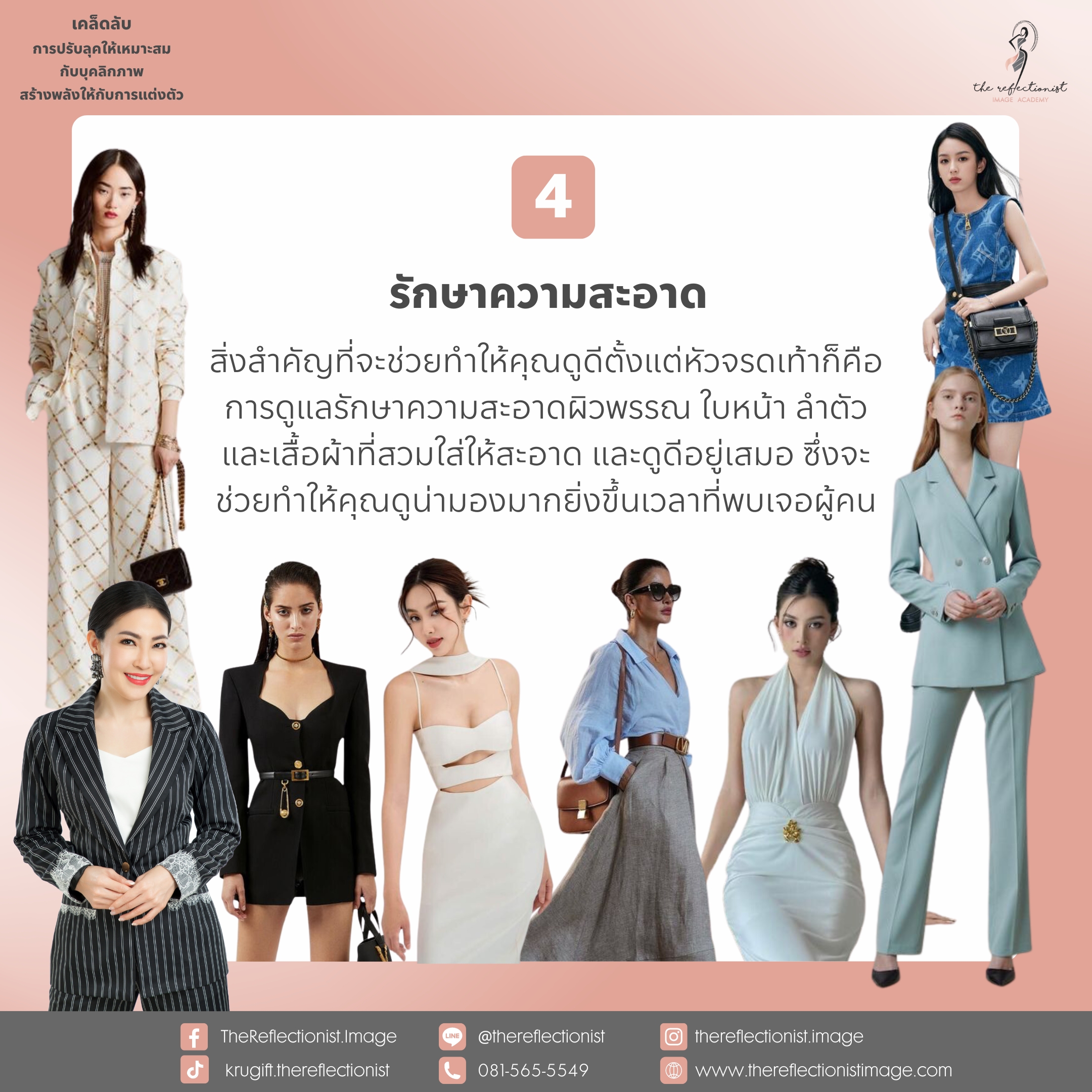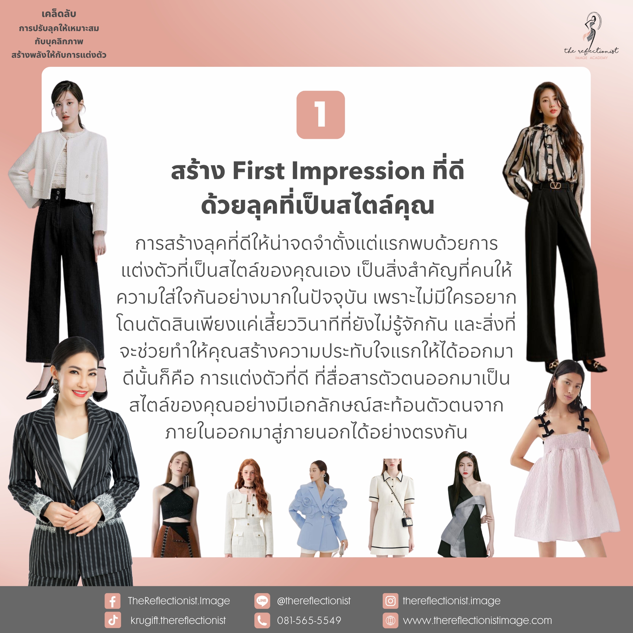 การเลือกเสื้อผ้าให้ดูดี เหมาะกับโอกาส และมีความมั่นใจ จะช่วยสร้างความน่าเชื่อถือ ซึ่งเป็นส่วนสำคัญที่มีผลต่อ First Impression โดยคุณจำเป็นต้องรู้ว่าวันนี้คุณจะไปที่ไหน ทำอะไร และจะมีสถานการณ์สำคัญอะไรเกิดขึ้นบ้าง เพื่อเลือกแต่งตัวได้อย่างเหมาะสม และการแต่งตัวนั้นจะต้องสะท้อนตัวตนของคุณออกมาได้ในทันที สร้างภาพลักษณ์ที่ดี และน่าจดจำให้กับคุณ