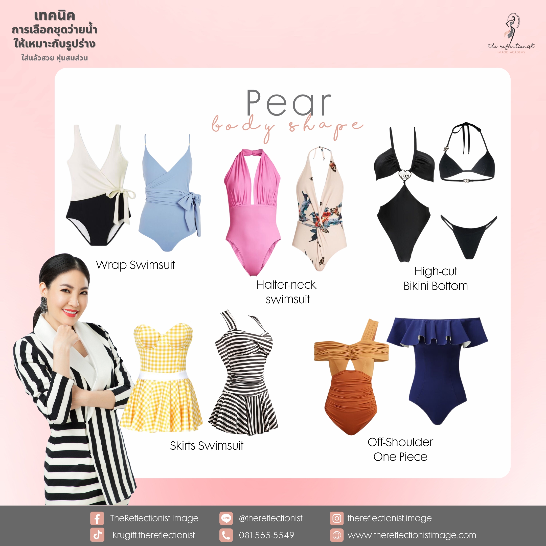 ชุดว่ายน้ำที่เหมาะกับหุ่นPear ก็คือ Wrap Swimsuit, Halter-neck Swimsuit, High-cut Bikini Bottom, Skirt Swimsuit, และ Off-Shoulder One Piece