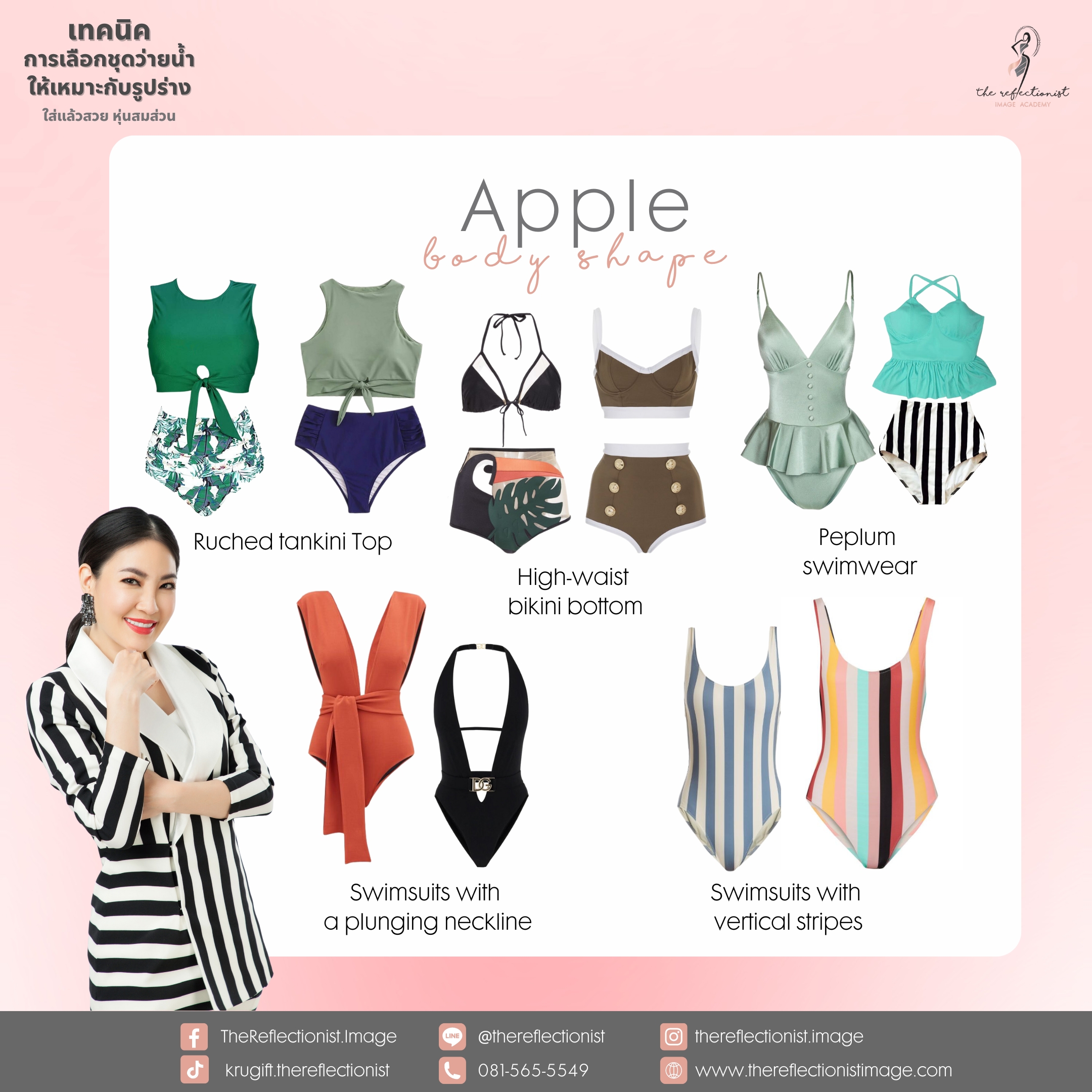 คนที่มีรูปร่างแบบ Apple Shape จะเหมาะกับชุดว่ายน้ำแบบที่มีเอวสูงเพื่อเก็บช่วงหน้าท้อง หรือมีดีเทลช่วยพรางช่วงหน้าท้อง รวมถึงชุดที่มีลายทางแนวตั้ง จะช่วยพรางหุ่นให้ดูเพรียวมากยิ่งขึ้น