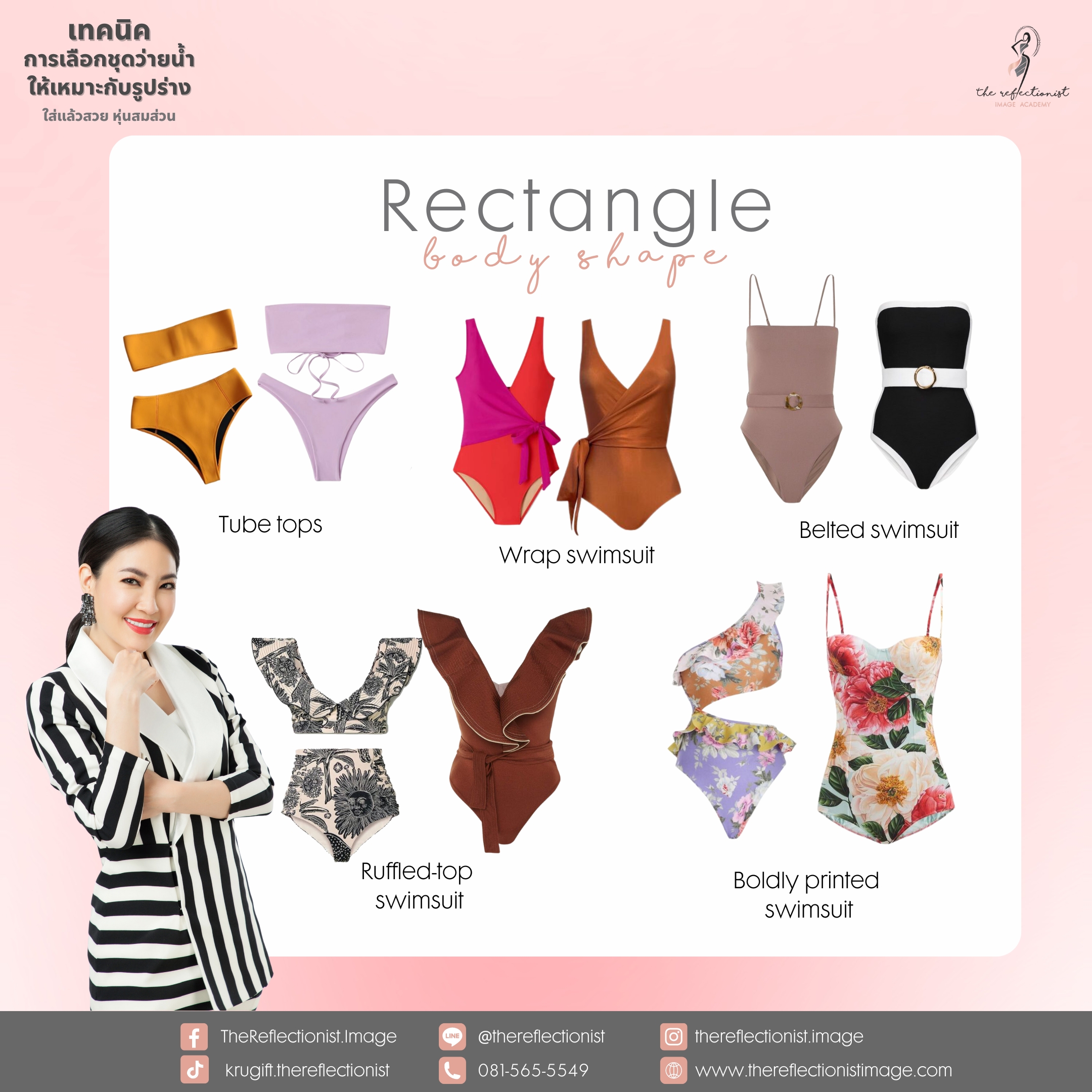 คนที่มีรูปร่างแบบ Rectangle Shape เป็นคนที่มีหุ่นแบบตรงๆ ชุดว่ายน้ำที่ควรเลือกใส่ควรเน้นให้มีดีเทล มีสีสัน ลวดลายช่วงอก และสโพก หรือชุดที่เพิ่มมิติส่วนเว้าส่วนโค้งให้รูปร่าง ดังนั้นจึงเหมาะกับชุดว่ายน้ำแบบ Tube Top, Wrap Swimsuit, Belted Swimsuit, Ruffled-Top Swimsuit, และ Boldly Printed Swimsuit ค่ะ