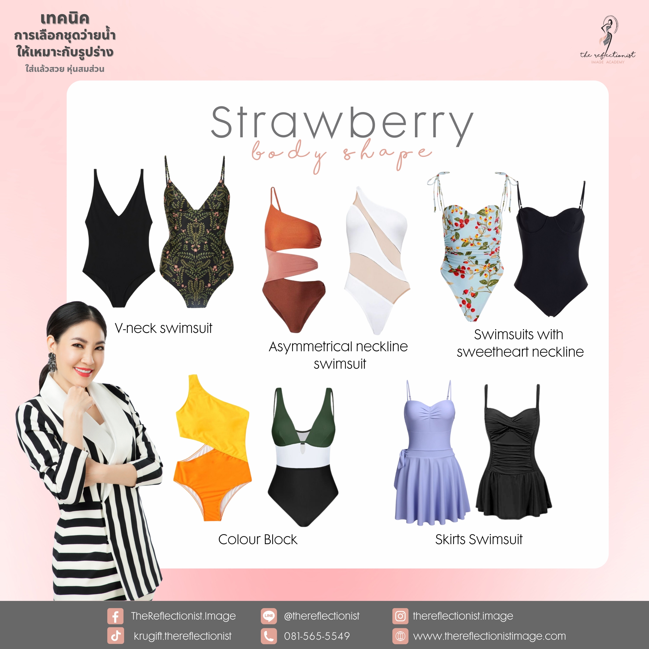 คนที่มีรูปร่างแบบ Strawberry Shape คือคนที่ช่วงบนกว้างกว่าช่วงล่าง ทำให้เหมาะกับการใส่ชุดว่ายน้ำแบบคอวี หรือชุดว่ายนน้ำที่มีดีเทลลูกเล่น สร้างมิติช่วงเอว หรือสะโพก เพื่อให้ช่วงบน และช่วงล่างสมส่วนกัน ซึ่งชุดว่ายน้ำที่้เหมาะกับสาวหุ่นนี้ก็คือ V-neck Swimsuit, Asymmetrical Neckline Swimsuit, Swimsuit with Sweetheart Neckline, Colour Block, และ Skirt Swimsuit