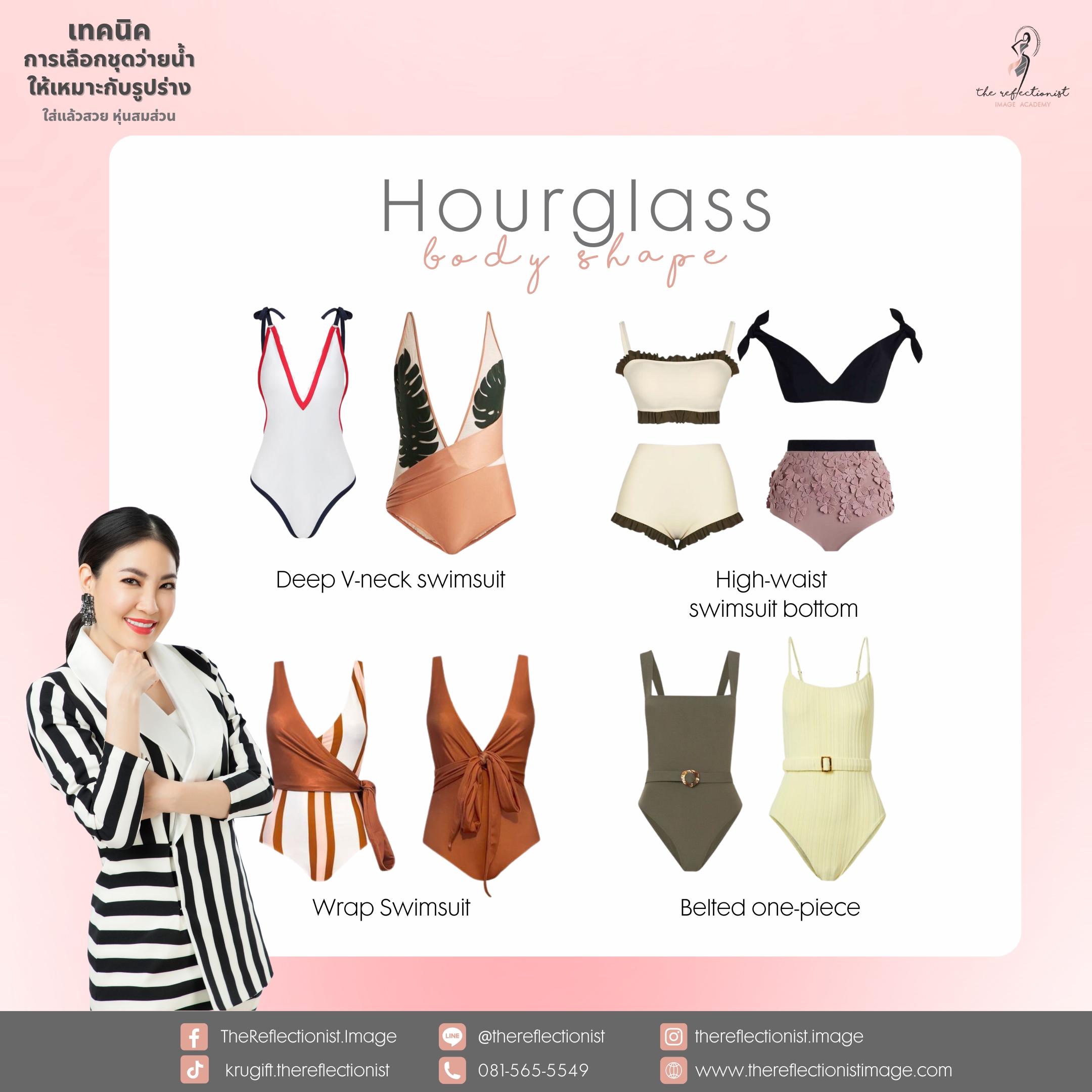 คนที่มีรูปร่างแบบ Hourglass Shape คือคนที่มีหุ่นสวย ช่วงบน และช่วงล่างสมส่วนกัน มีเอวคอด และส่วนเว้าส่วนโค้งของร่างกายชัดเจน การเลือกใส่ชุดว่ายน้ำแบบ Deep V-neck Swimsuit, High-waist Swimsuit bottom, Wrap Swimsuit, และ Belted one-piece จะสวย และเข้ากับรูปร่างของคุณมากๆ