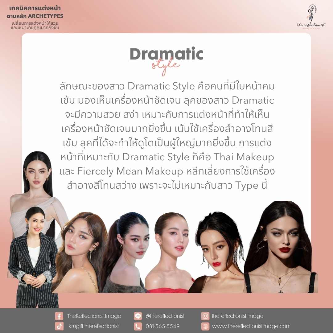 ลักษณะของสาว Dramatic Style คือคนที่มีใบหน้าคมเข้ม มองเห็นเครื่องหน้าชัดเจน ลุคของสาว Dramatic จะมีความสวย สง่า เหมาะกับการแต่งหน้าที่ทำให้เห็นเครื่องหน้าชัดเจนมากยิ่งขึ้น เน้นใช้เครื่องสำอางโทนสีเข้ม ลุคที่ได้จะทำให้ดูโตเป็นผู้ใหญ่มากยิ่งขึ้น การแต่งหน้าที่เหมาะกับ Dramatic Style ก็คือ Thai Makeup และ Fiercely Mean Makeup หลีกเลี่ยงการใช้เครื่องสำอางสีโทนสว่าง เพราะจะไม่เหมาะกับสาว Type นี้