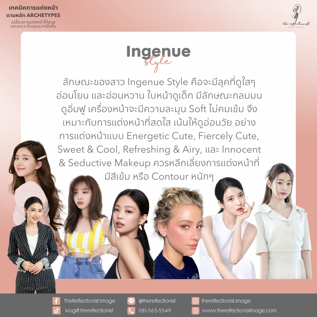 ลักษณะของสาว Ingenue Style คือจะมีลุคที่ดูใสๆ อ่อนโยน และอ่อนหวาน ใบหน้าดูเด็ก มีลักษณะกลมมน ดูอิ่มฟู เครื่องหน้าจะมีความละมุน Soft ไม่คมเข้ม จึงเหมาะกับการแต่งหน้าที่สดใส เน้นให้ดูอ่อนวัย อย่างการแต่งหน้าแบบ Energetic Cute, Fiercely Cute, Sweet & Cool, Refreshing & Airy, และ Innocent & Seductive Makeup ควรหลีกเลี่ยงการแต่งหน้าที่มีสีเข้ม หรือ Contour หนักๆ