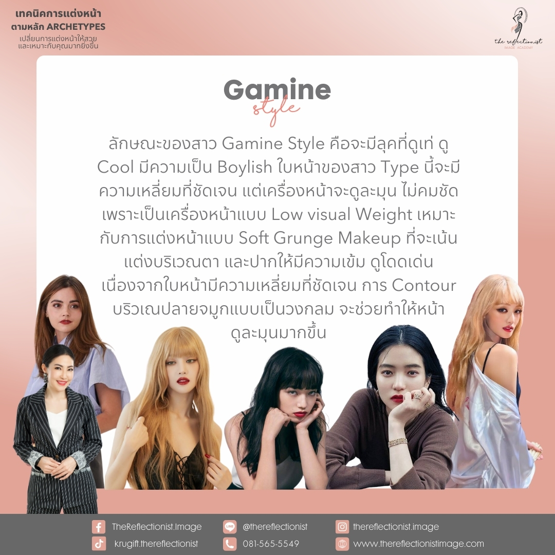 ลักษณะของสาว Gamine Style คือจะมีลุคที่ดูเท่ ดู Cool มีความเป็น Boylish ใบหน้าของสาว Type นี้จะมีความเหลี่ยมที่ชัดเจน แต่เครื่องหน้าจะดูละมุน ไม่คมชัด เพราะเป็นเครื่องหน้าแบบ Low visual Weight เหมาะกับการแต่งหน้าแบบ Soft Grunge Makeup ที่จะเน้นแต่งบริเวณตา และปากให้มีความเข้ม ดูโดดเด่น เนื่องจากใบหน้ามีความเหลี่ยมที่ชัดเจน การ Contour บริวเณปลายจมูกแบบเป็นวงกลม จะช่วยทำให้หน้า