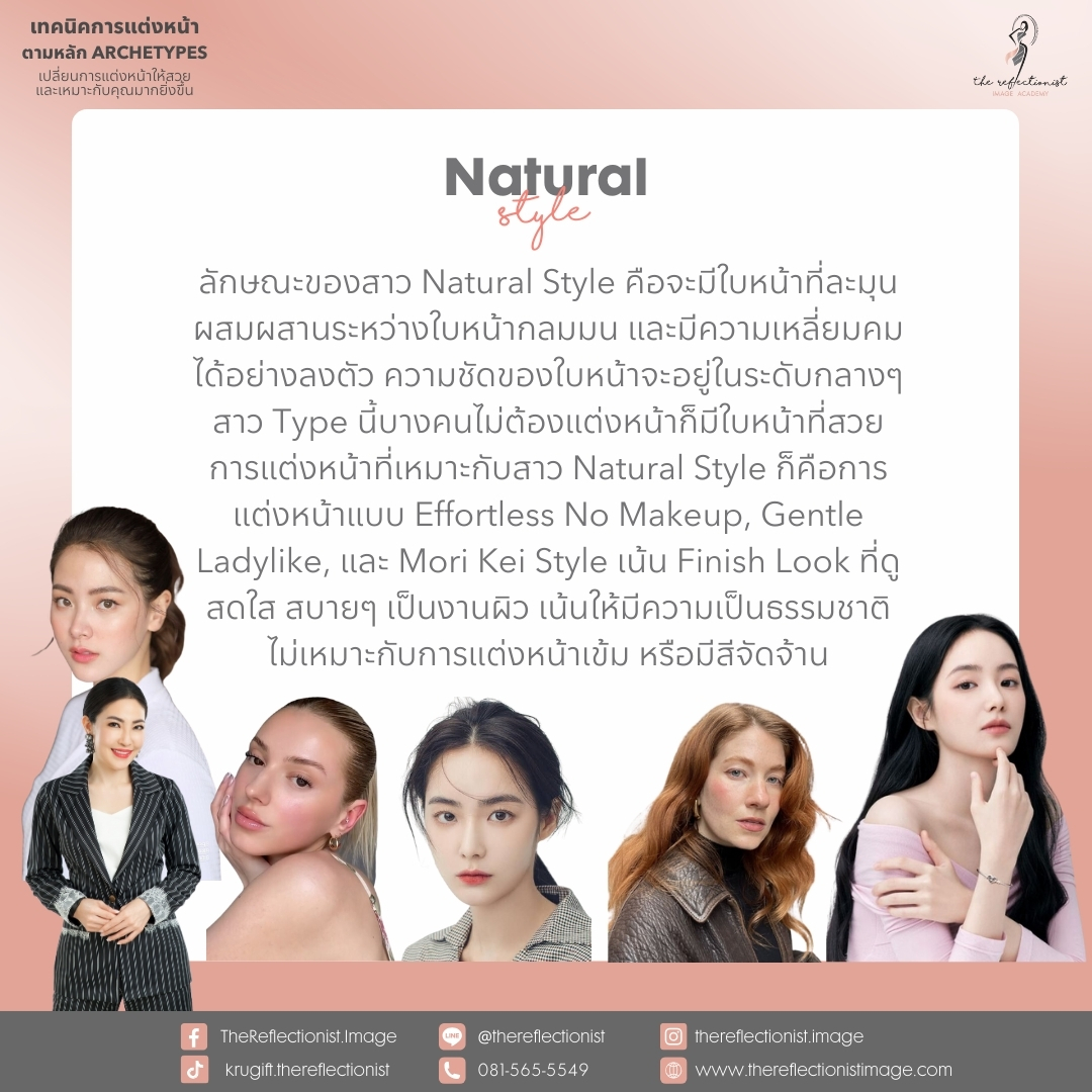 ลักษณะของสาว Natural Style คือจะมีใบหน้าที่ละมุน ผสมผสานระหว่างใบหน้ากลมมน และมีความเหลี่ยมคมได้อย่างลงตัว ความชัดของใบหน้าจะอยู่ในระดับกลางๆ สาว Type นี้บางคนไม่ต้องแต่งหน้าก็มีใบหน้าที่สวย การแต่งหน้าที่เหมาะกับสาว Natural Style ก็คือการแต่งหน้าแบบ Effortless No Makeup, Gentle Ladylike, และ Mori Kei Style เน้น Finish Look ที่ดูสดใส สบายๆ เป็นงานผิว เน้นให้มีความเป็นธรรมชาติ ไม่เหมาะกับการแต่งหน้าเข้ม หรือมีสีจัดจ้าน
