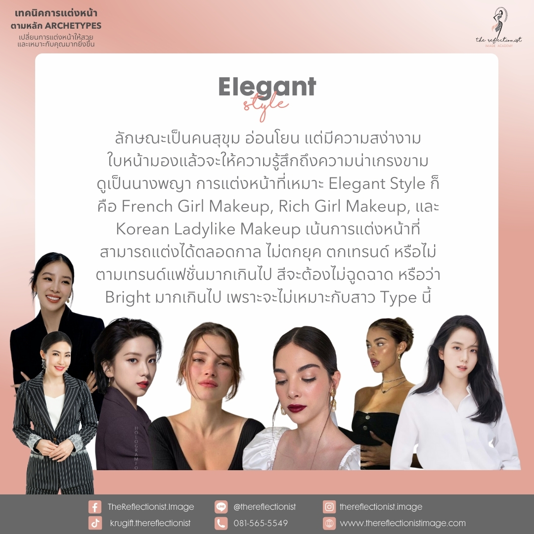 ลักษณะเป็นคนสุขุม อ่อนโยน แต่มีความสง่างาม ใบหน้ามองแล้วจะให้ความรู้สึกถึงความน่าเกรงขาม ดูเป็นนางพญา การแต่งหน้าที่เหมาะ Elegant Style ก็คือ French Girl Makeup, Rich Girl Makeup, และ Korean Ladylike Makeup เน้นการแต่งหน้าที่สามารถแต่งได้ตลอดกาล ไม่ตกยุค ตกเทรนด์ หรือไม่ตามเทรนด์แฟชั่นมากเกินไป สีจะต้องไม่ฉูดฉาด หรือว่า Bright มากเกินไป เพราะจะไม่เหมาะกับสาว Type นี้