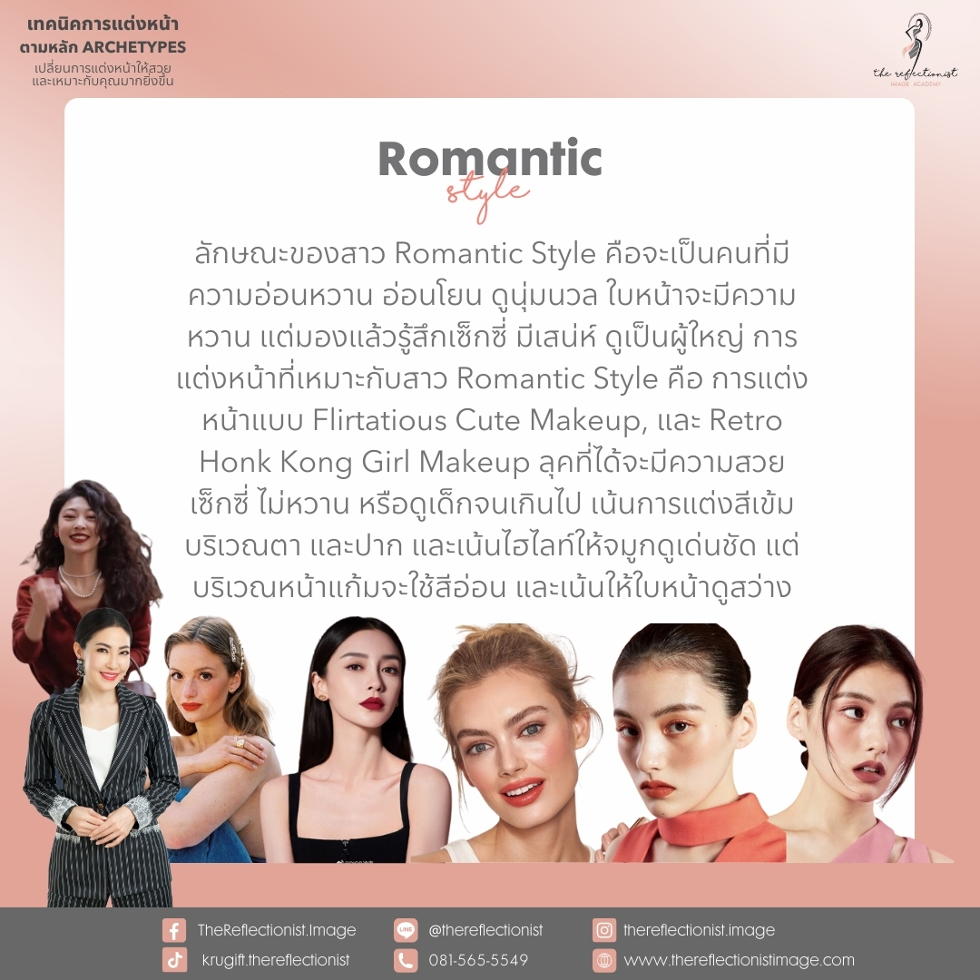 ลักษณะของสาว Romantic Style คือจะเป็นคนที่มีความอ่อนหวาน อ่อนโยน ดูนุ่มนวล ใบหน้าจะมีความหวาน แต่มองแล้วรู้สึกเซ็กซี่ มีเสน่ห์ ดูเป็นผู้ใหญ่ การแต่งหน้าที่เหมาะกับสาว Romantic Style คือ การแต่งหน้าแบบ Flirtatious Cute Makeup, และ Retro Honk Kong Girl Makeup ลุคที่ได้จะมีความสวย เซ็กซี่ ไม่หวาน หรือดูเด็กจนเกินไป เน้นการแต่งสีเข้มบริเวณตา และปาก และเน้นไฮไลท์ให้จมูกดูเด่นชัด แต่บริเวณหน้าแก้มจะใช้สีอ่อน และเน้นให้ใบหน้าดูสว่าง