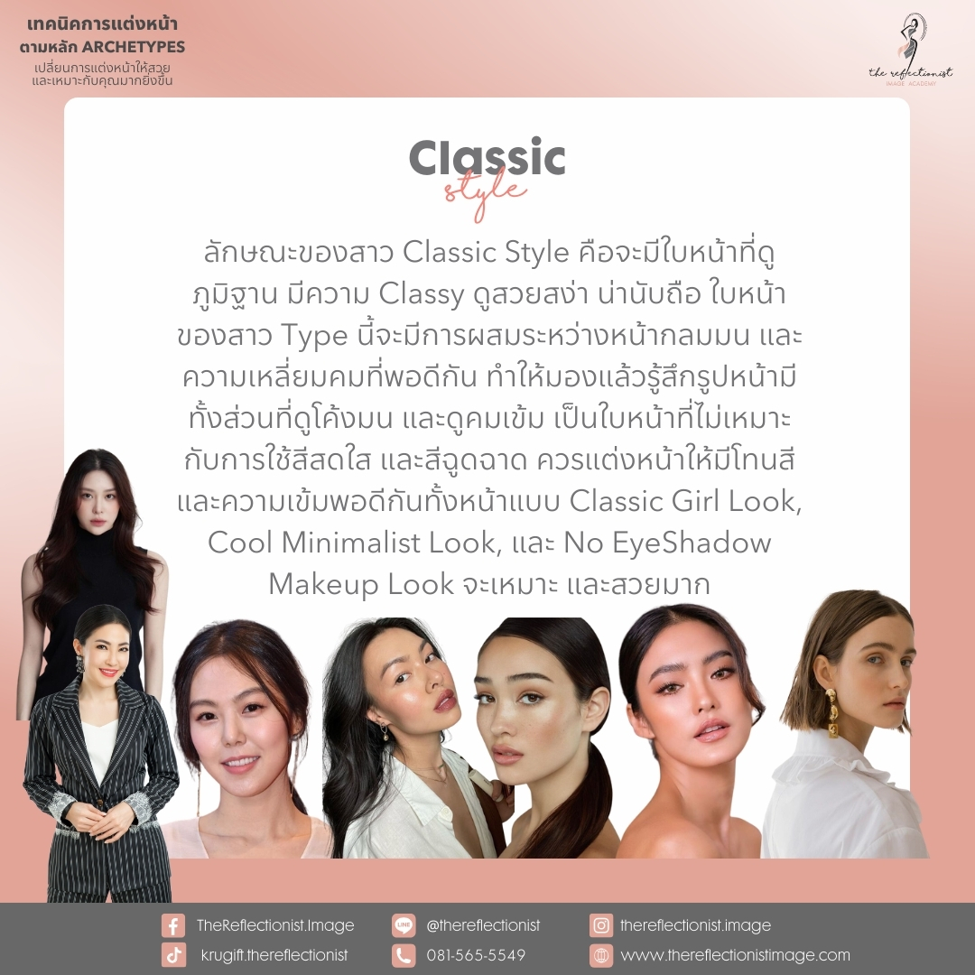 ลักษณะของสาว Classic Style คือจะมีใบหน้าที่ดูภูมิฐาน มีความ Classy ดูสวยสง่า น่านับถือ ใบหน้าของสาว Type นี้จะมีการผสมระหว่างหน้ากลมมน และความเหลี่ยมคมที่พอดีกัน ทำให้มองแล้วรู้สึกรูปหน้ามีทั้งส่วนที่ดูโค้งมน และดูคมเข้ม เป็นใบหน้าที่ไม่เหมาะกับการใช้สีสดใส และสีฉูดฉาด ควรแต่งหน้าให้มีโทนสี และความเข้มพอดีกันทั้งหน้าแบบ Classic Girl Look, Cool Minimalist Look, และ No EyeShadow Makeup Look จะเหมาะ และสวยมาก