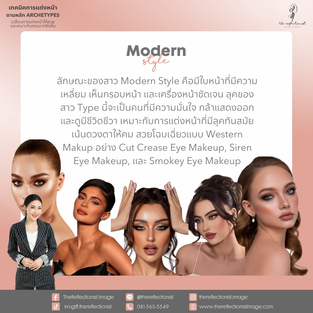 ลักษณะของสาว Modern Style คือมีใบหน้าที่มีความเหลี่ยม เห็นกรอบหน้า และเครื่องหน้าชัดเจน ลุคของสาว Type นี้จะเป็นคนที่มีความมั่นใจ กล้าแสดงออก และดูมีชีวิตชีวา เหมาะกับการแต่งหน้าที่มีลุคทันสมัย เน้นดวงตาให้คม สวยโฉบเฉี่ยวแบบ Western Makup อย่าง Cut Crease Eye Makeup, Siren Eye Makeup, และ Smokey Eye Makeup
