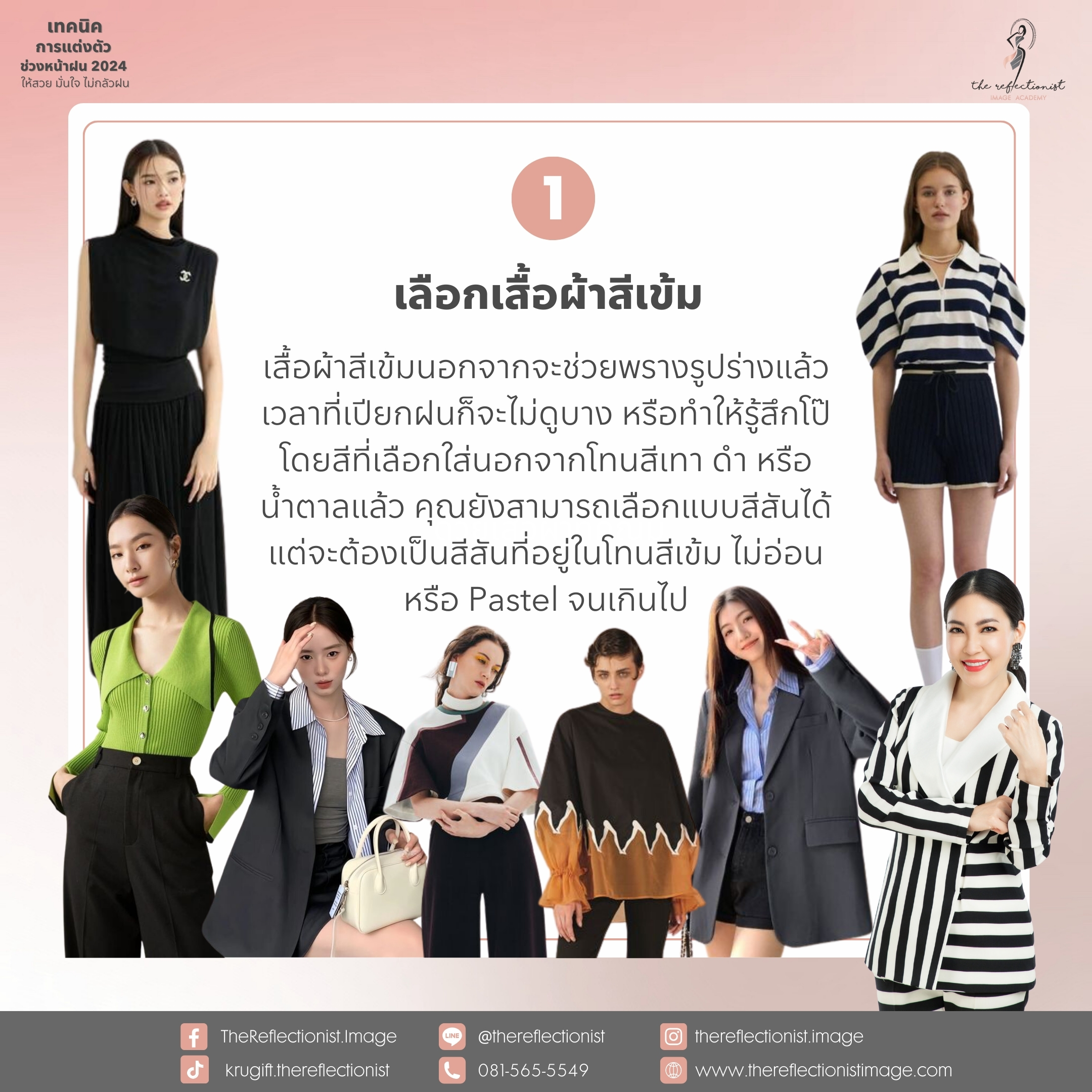 เสื้อผ้าสีเข้มนอกจากจะช่วยพรางรูปร่างแล้ว เวลาที่เปียกฝนก็จะไม่ดูบาง หรือทำให้รู้สึกโป๊ โดยสีที่เลือกใส่นอกจากโทนสีเทา ดำ หรือน้ำตาลแล้ว คุณยังสามารถเลือกแบบสีสันได้ แต่จะต้องเป็นสีสันที่อยู่ในโทนสีเข้ม ไม่อ่อน หรือ Pastel จนเกินไป
