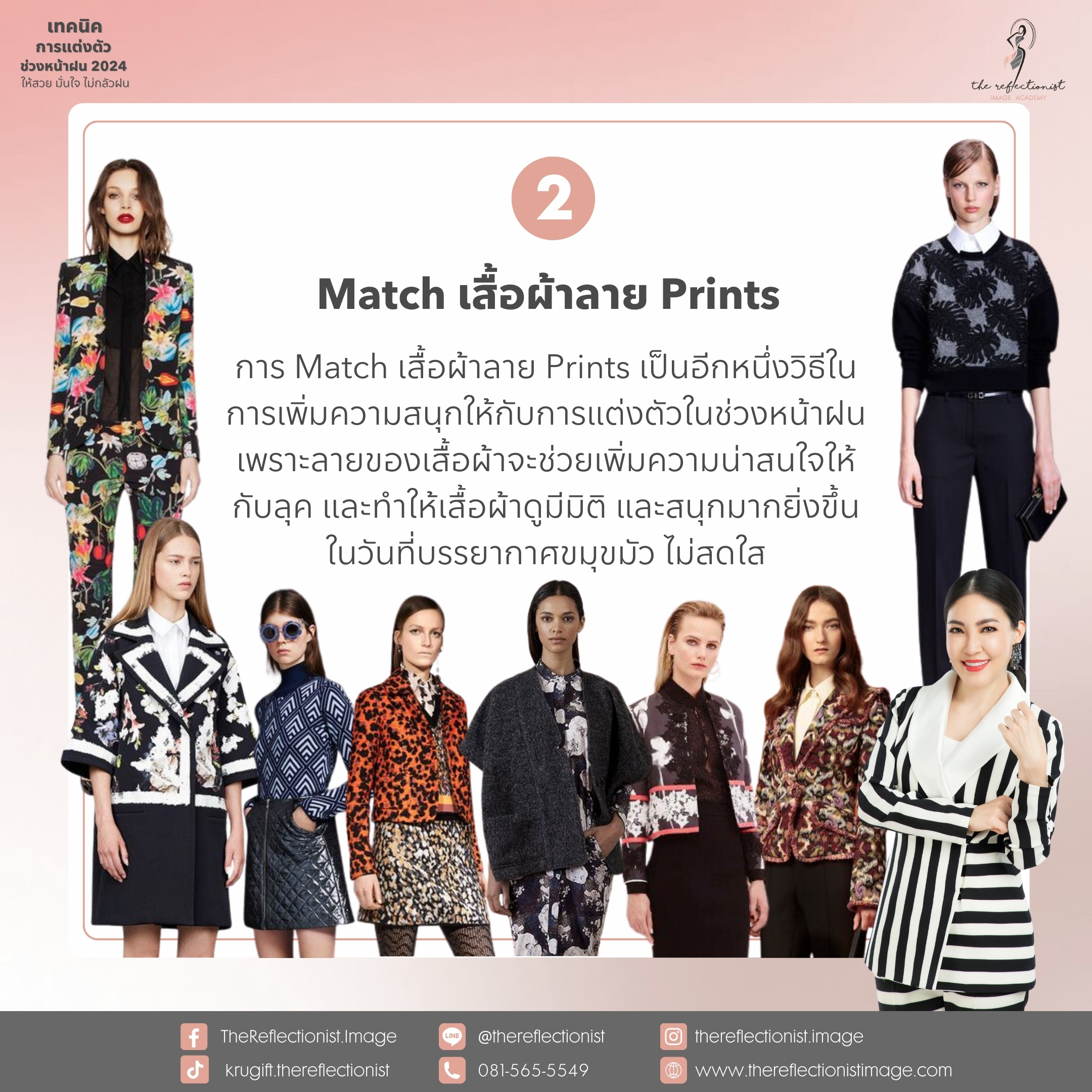 การ Match เสื้อผ้าลาย Prints เป็นอีกหนึ่งวิธีในการเพิ่มความสนุกให้กับการแต่งตัวในช่วงหน้าฝน เพราะลายของเสื้อผ้าจะช่วยเพิ่มความน่าสนใจให้กับลุค และทำให้เสื้อผ้าดูมีมิติ และสนุกมากยิ่งขึ้นในวันที่บรรยากาศขมุกขมัว ไม่สดใส
