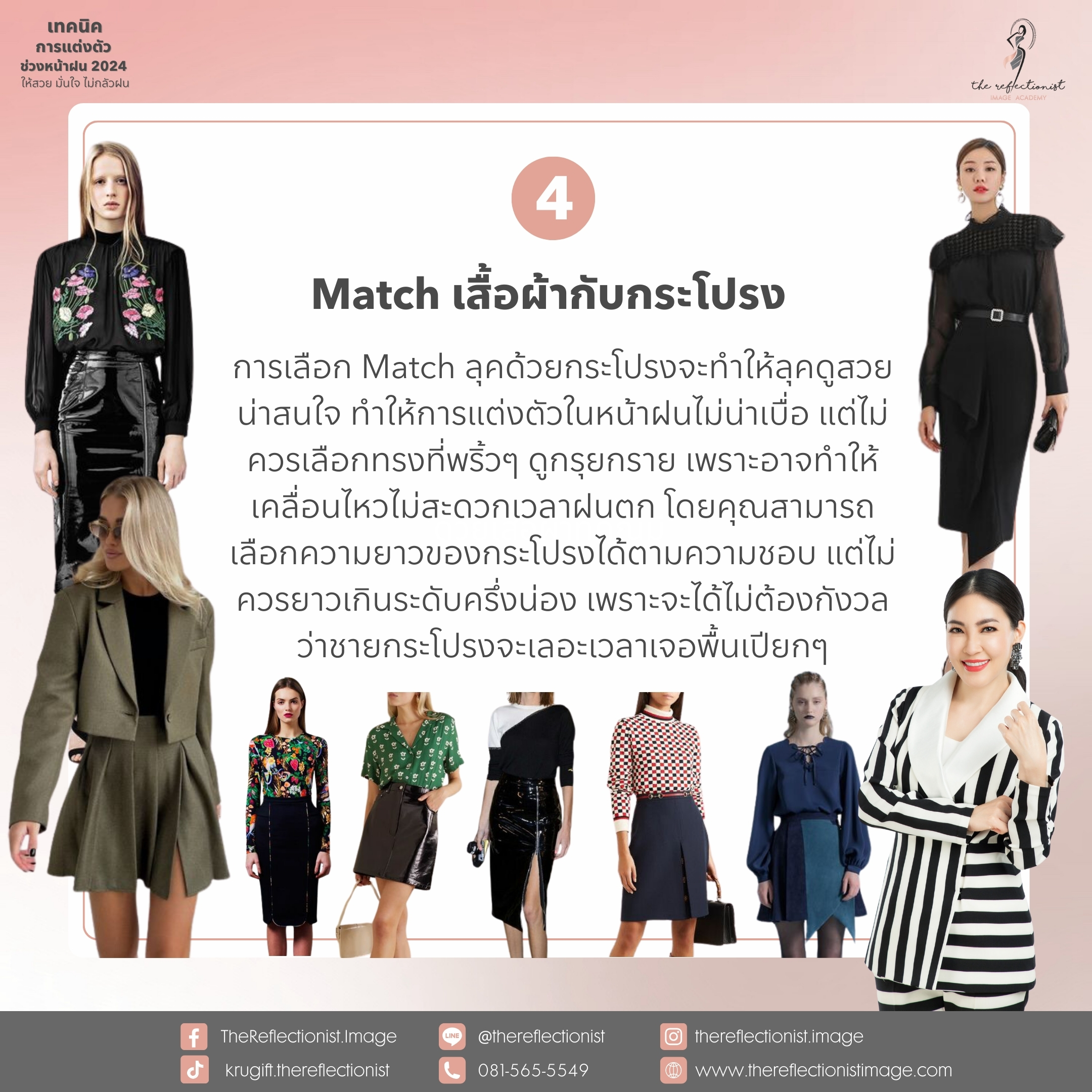 การเลือก Match ลุคด้วยกระโปรงจะทำให้ลุคดูสวย น่าสนใจ ทำให้การแต่งตัวในหน้าฝนไม่น่าเบื่อ แต่ไม่ควรเลือกทรงที่พริ้วๆ ดูกรุยกราย เพราะอาจทำให้เคลื่อนไหวไม่สะดวกเวลาฝนตก โดยคุณสามารถเลือกความยาวของกระโปรงได้ตามความชอบ แต่ไม่ควรยาวเกินระดับครึ่งน่อง เพราะจะได้ไม่ต้องกังวลว่าชายกระโปรงจะเลอะเวลาเจอพื้นเปียกๆ