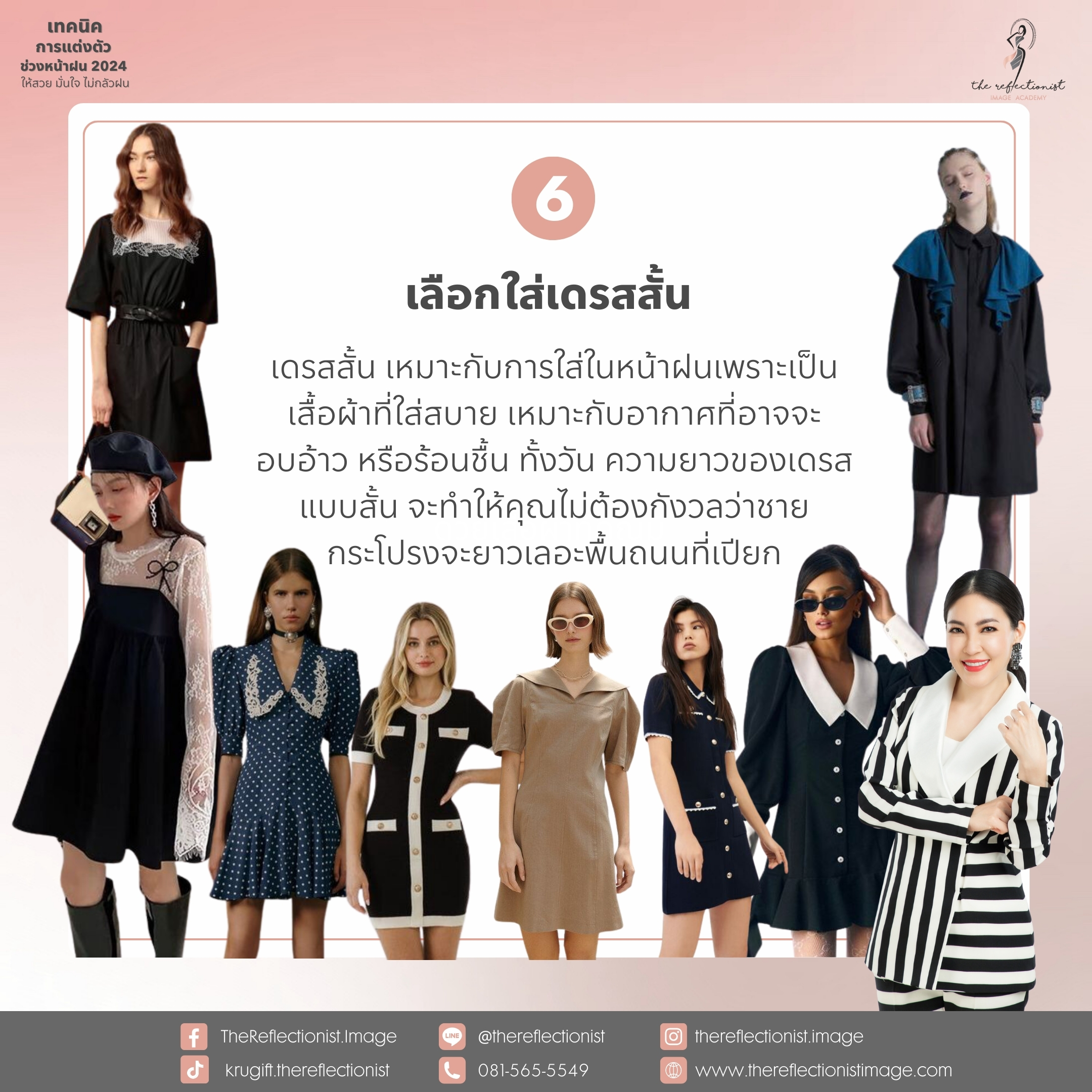 เดรสสั้น เหมาะกับการใส่ในหน้าฝนเพราะเป็นเสื้อผ้าที่ใส่สบาย เหมาะกับอากาศที่อบอ้าว ร้อนชื้น ทั้งวัน ความยาวของเดรสแบบสั้น จะทำให้คุณไม่ต้องกังวลว่าชายกระโปรงจะยาวเลอะพื้นถนนที่เปียก