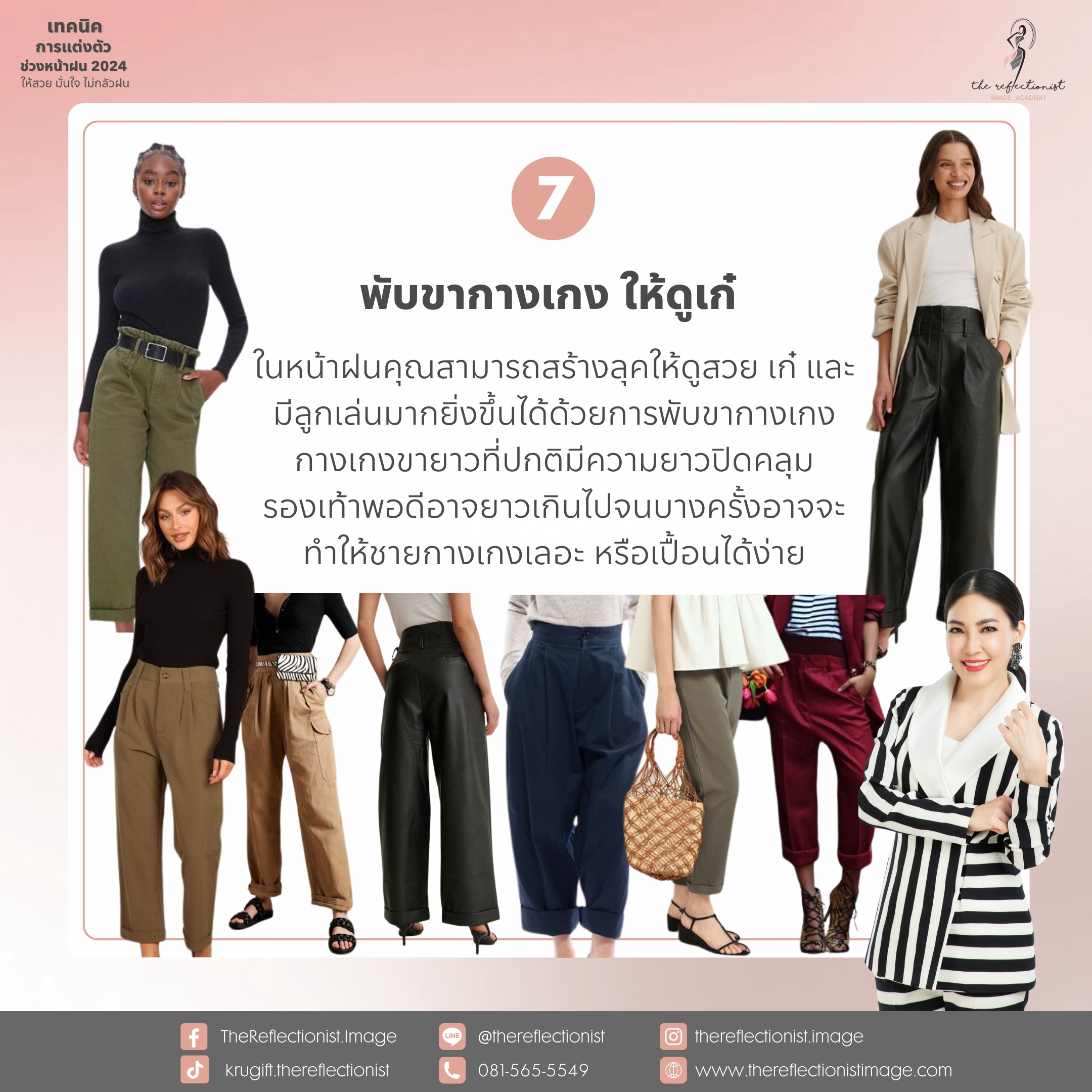 ในหน้าฝนคุณสามารถสร้างลุคให้ดูสวย เก๋ และมีลูกเล่นมากยิ่งขึ้นได้ด้วยการพับขากางเกง กางเกงขายาวที่ปกติมีความยาวปิดคลุมรองเท้าพอดีอาจยาวเกินไปจนบางครั้งอาจจะทำให้ชายกางเกงเลอะ หรือเปื้อนได้ง่าย