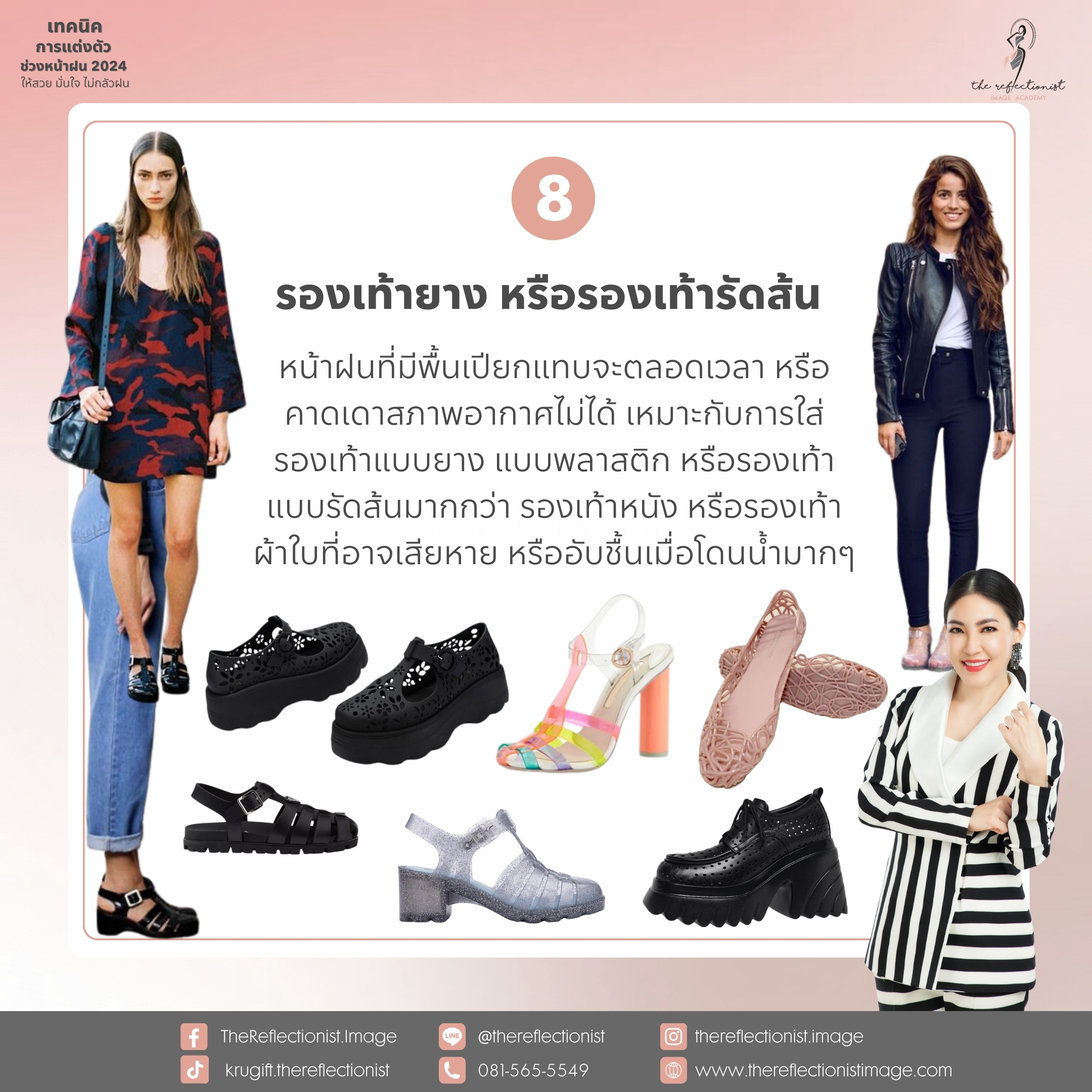 หน้าฝนที่มีพื้นเปียกแทบจะตลอดเวลา หรือคาดเดาสภาพอากาศไม่ได้ เหมาะกับการใส่รองเท้าแบบยาง แบบพลาสติก หรือรองเท้าแบบรัดส้นมากกว่า รองเท้าหนัง หรือรองเท้าผ้าใบที่อาจเสียหาย หรืออับชื้นเมื่อโดนน้ำมากๆ