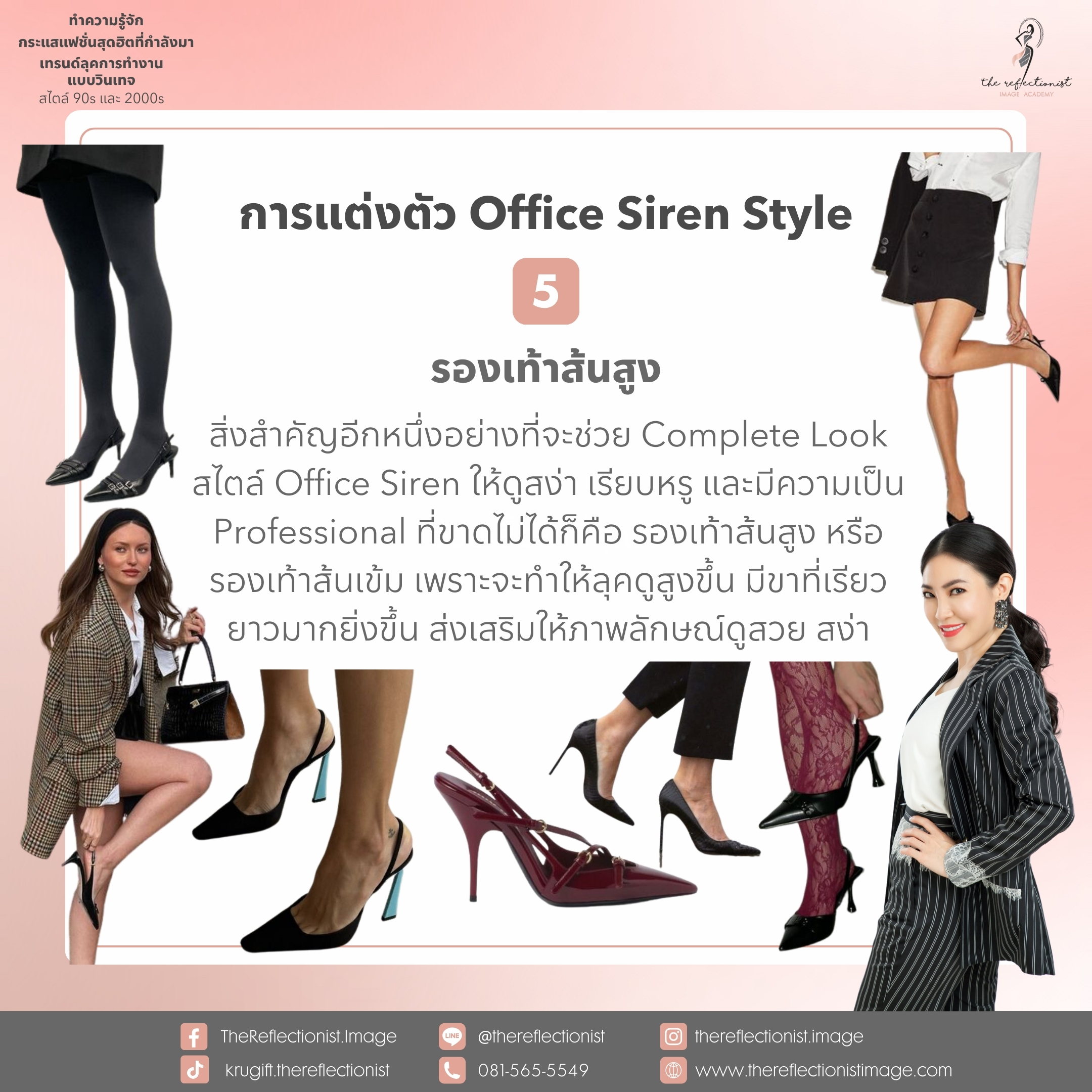 สิ่งสำคัญอีกหนึ่งอย่างที่จะช่วย Complete Look สไตล์ Office Siren ให้ดูสง่า เรียบหรู และมีความเป็น Professional ที่ขาดไม่ได้ก็คือ รองเท้าส้นสูง หรือรองเท้าส้นเข้ม เพราะจะทำให้ลุคดูสูงขึ้น มีขาที่เรียวยาวมากยิ่งขึ้น ส่งเสริมให้ภาพลักษณ์ดูสวย สง่า