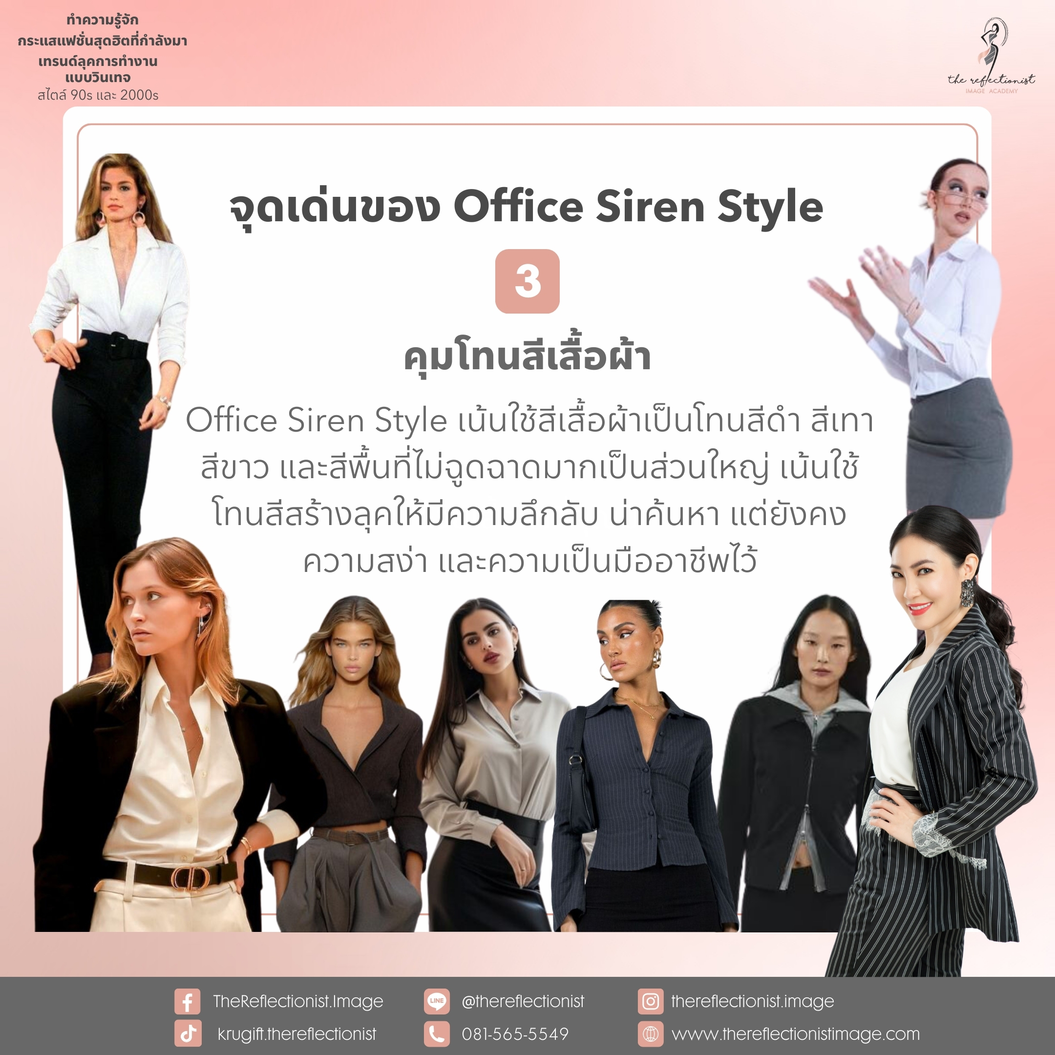 Office Siren Style เน้นใช้สีเสื้อผ้าเป็นโทนสีดำ สีเทา สีขาว และสีพื้นที่ไม่ฉูดฉาดมากเป็นส่วนใหญ่ เน้นใช้โทนสีสร้างลุคให้มีความลึกลับ น่าค้นหา แต่ยังคงความสง่า และความเป็นมืออาชีพไว้