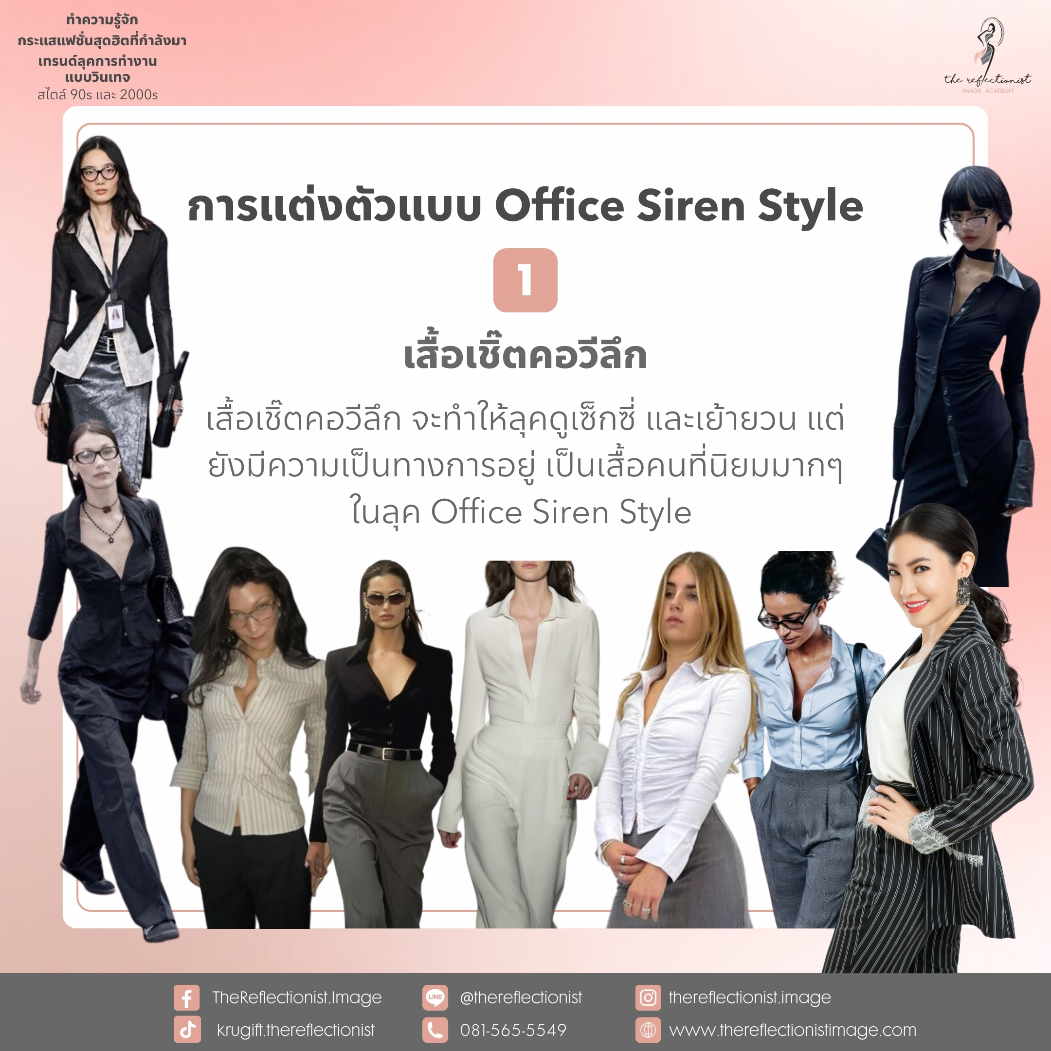 เสื้อเชิ๊ตคอวีลึก จะทำให้ลุคดูเซ็กซี่ และเย้ายวน แต่ยังมีความเป็นทางการอยู่ เป็นเสื้อคนที่นิยมมากๆในลุค Office Siren Style