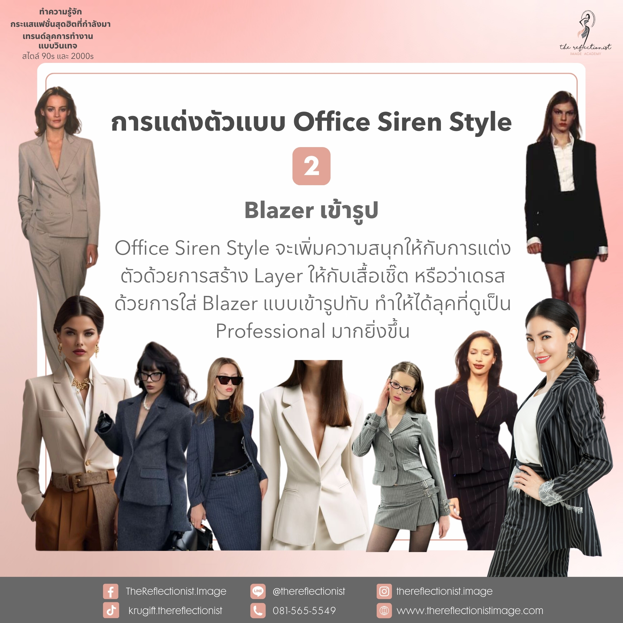 Office Siren Style จะเพิ่มความสนุกให้กับการแต่งตัวด้วยการสร้าง Layer ให้กับเสื้อเชิ๊ต หรือว่าเดรสด้วยการใส่Blazerแบบเข้ารูปทับ ทำให้ได้ลุคที่ดูเป็น Professional มากยิ่งขึ้น