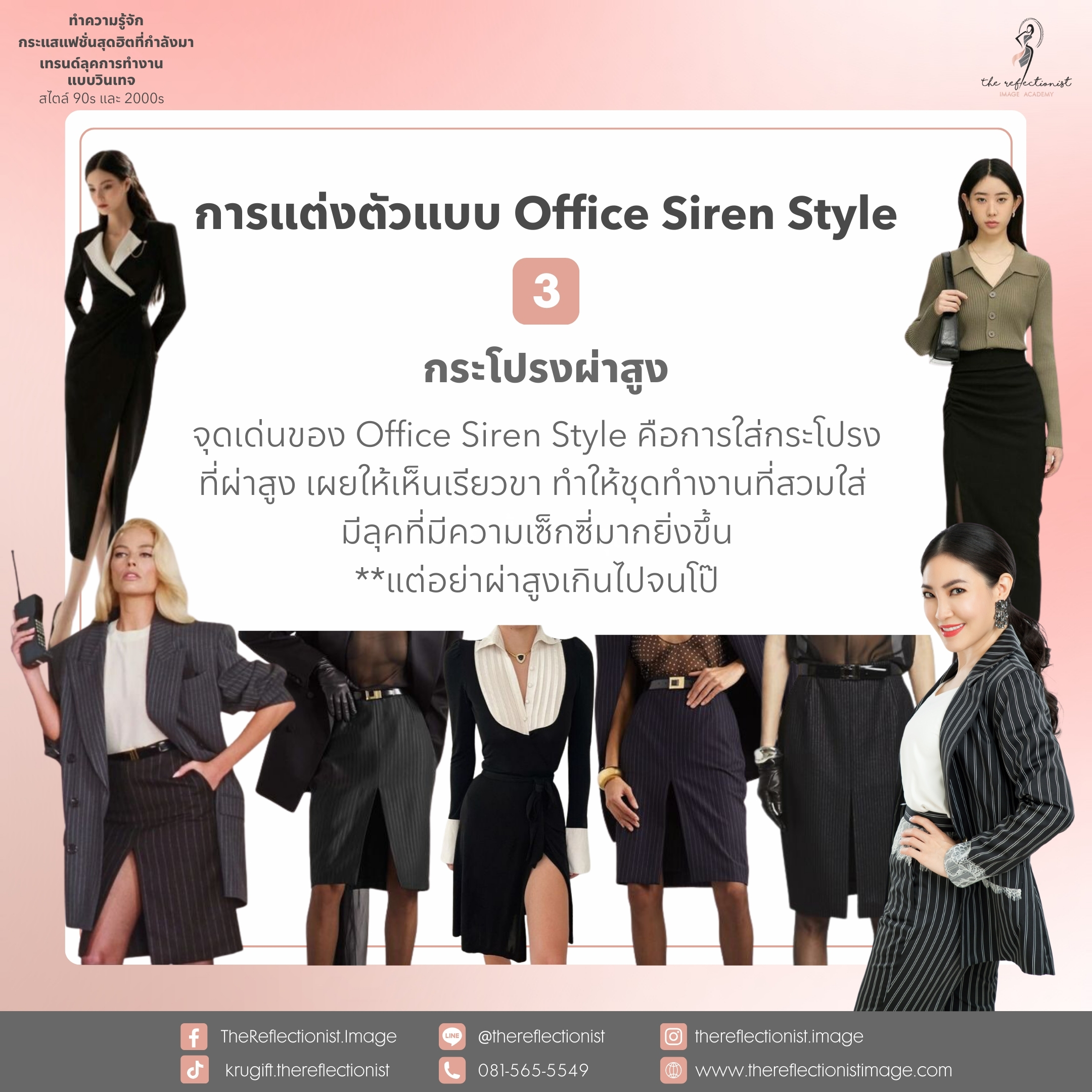 จุดเด่นของ Office Siren Style คือการใส่กระโปรงที่ผ่าสูง เผยให้เห็นเรียวขา ทำให้ชุดทำงานที่สวมใส่ มีลุคที่มีความเซ็กซี่มากยิ่งขึ้น