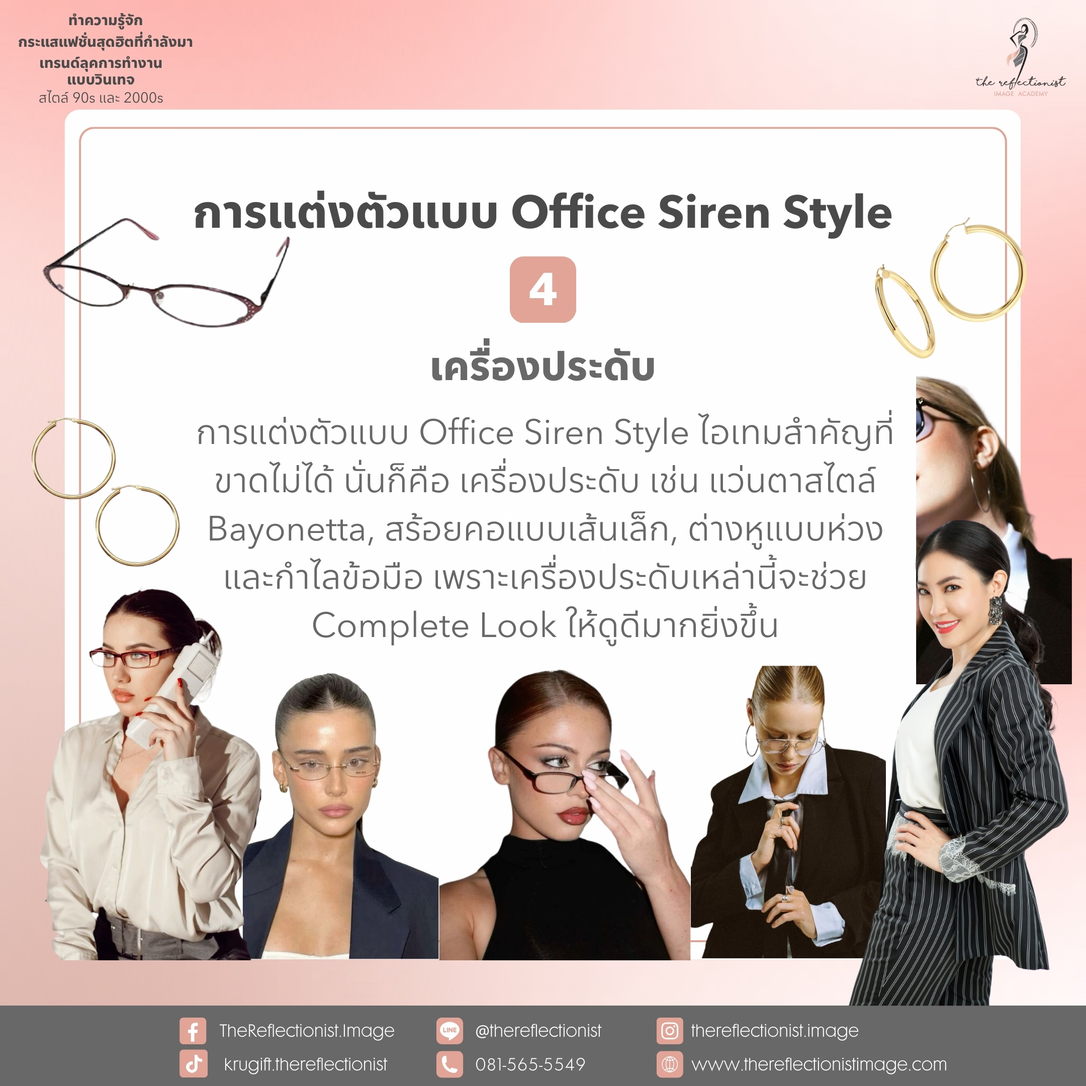 การแต่งตัวแบบ Office Siren Style ไอเทมสำคัญที่ขาดไม่ได้ นั่นก็คือ เครื่องประดับ เช่น แว่นตาสไตล์ Bayonetta, สร้อยคอแบบเส้นเล็ก, ต่างหูแบบห่วง และกำไลข้อมือ เพราะเครื่องประดับเหล่านี้จะช่วย Complete Look ให้ดูดีมากยิ่งขึ้น