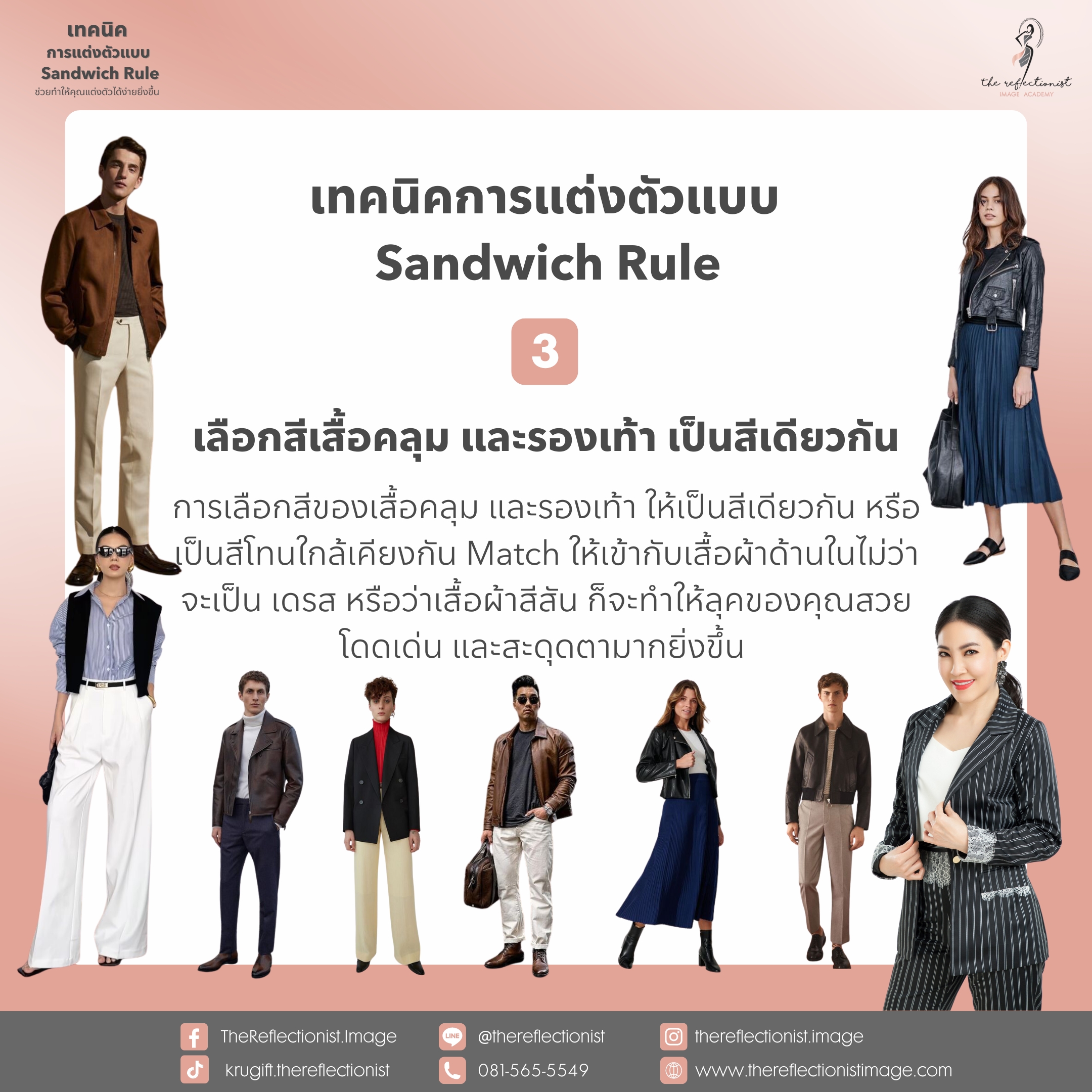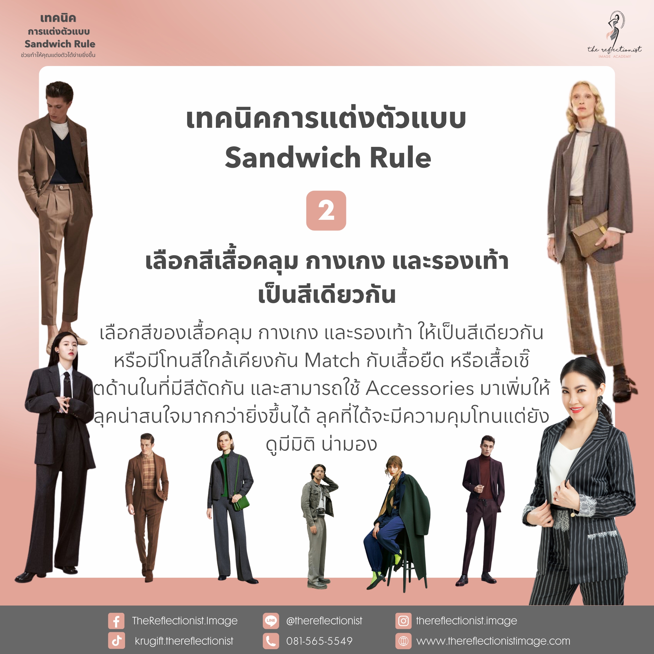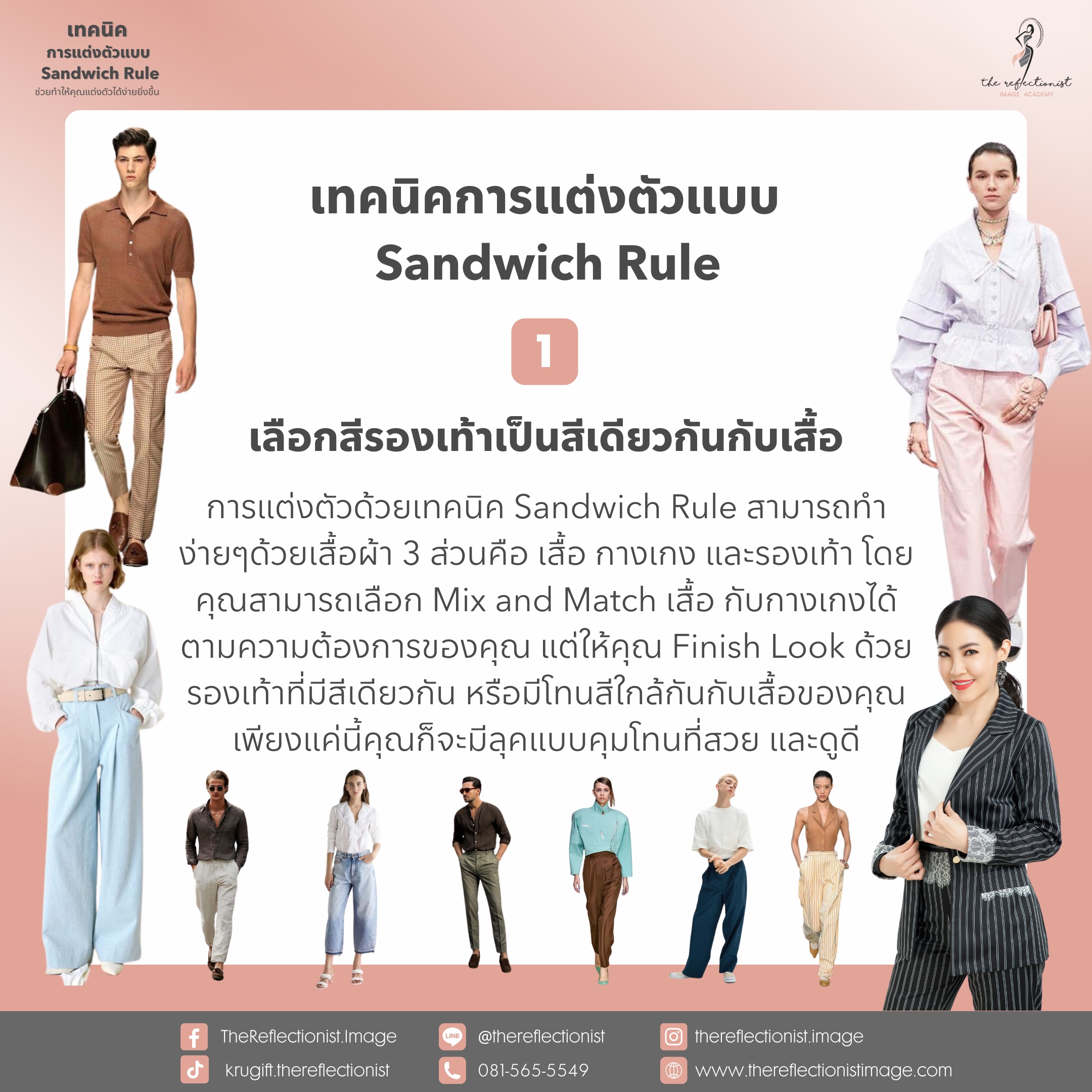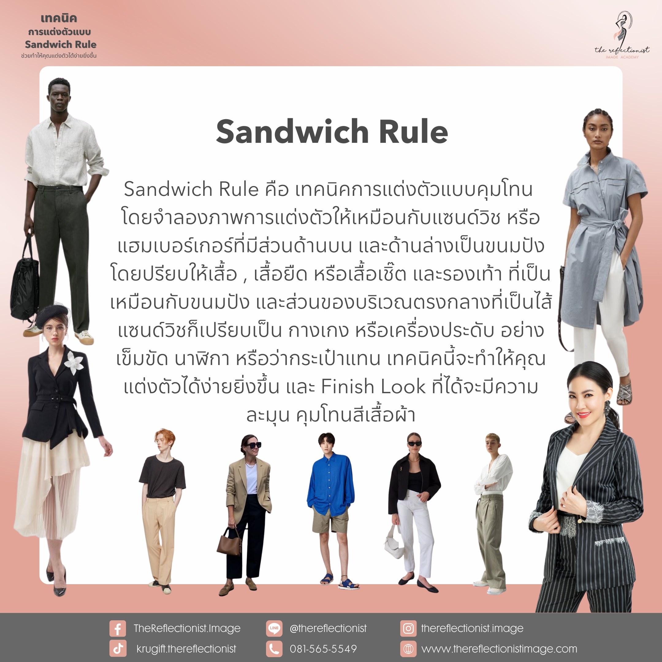 โดย Sandwich Rule คือ เทคนิคการแต่งตัวแบบคุมโทน โดยจำลองภาพการแต่งตัวให้เหมือนกับแซนด์วิช หรือแฮมเบอร์เกอร์ที่มีส่วนด้านบน และด้านล่างเป็นขนมปัง โดยปรียบให้เสื้อ , เสื้อยืด หรือเสื้อเชิ๊ต และรองเท้า ที่เป็นเหมือนกับขนมปัง และส่วนของบริเวณตรงกลางที่เป็นไส้แซนด์วิชก็เปรียบเป็น กางเกง หรือเครื่องประดับ อย่าง เข็มขัด นาฬิกา หรือว่ากระเป๋าแทน เทคนิคนี้จะทำให้คุณแต่งตัวได้ง่ายยิ่งขึ้น และ Finish Look ที่ได้จะมีความละมุน คุมโทนสีเสื้อผ้า