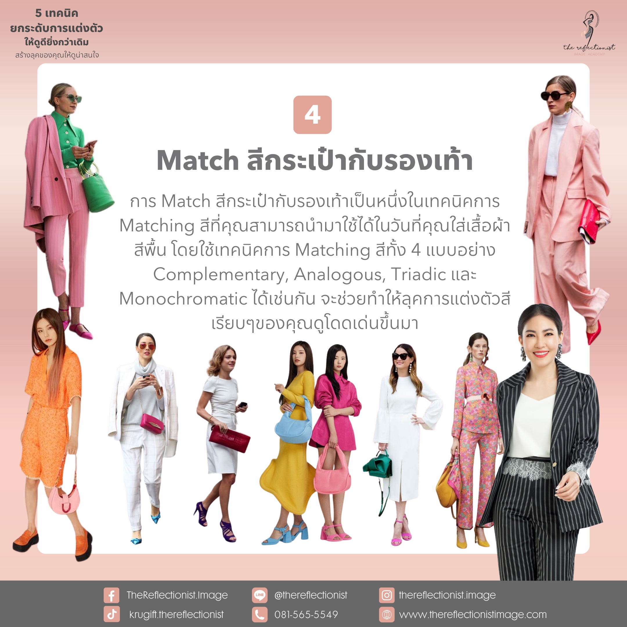 การ Match สีกระเป๋ากับรองเท้าเป็นหนึ่งในเทคนิคการ Matching สีที่คุณสามารถนำมาใช้ได้ในวันที่คุณใส่เสื้อผ้าสีพื้น โดยใช้เทคนิคการ Matching สีทั้ง 4 แบบอย่าง Complementary, Analogous, Triadic และ Monochromatic ได้เช่นกัน จะช่วยทำให้ลุคการแต่งตัวสีเรียบๆของคุณดูโดดเด่นขึ้นมา