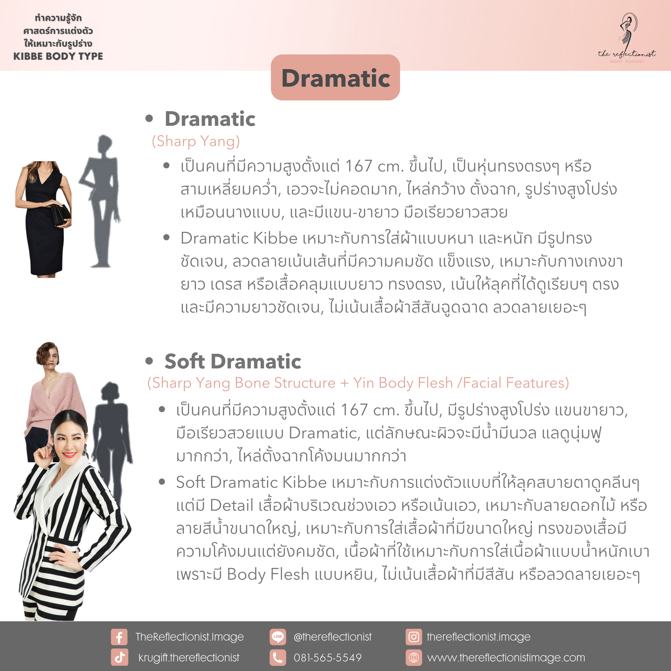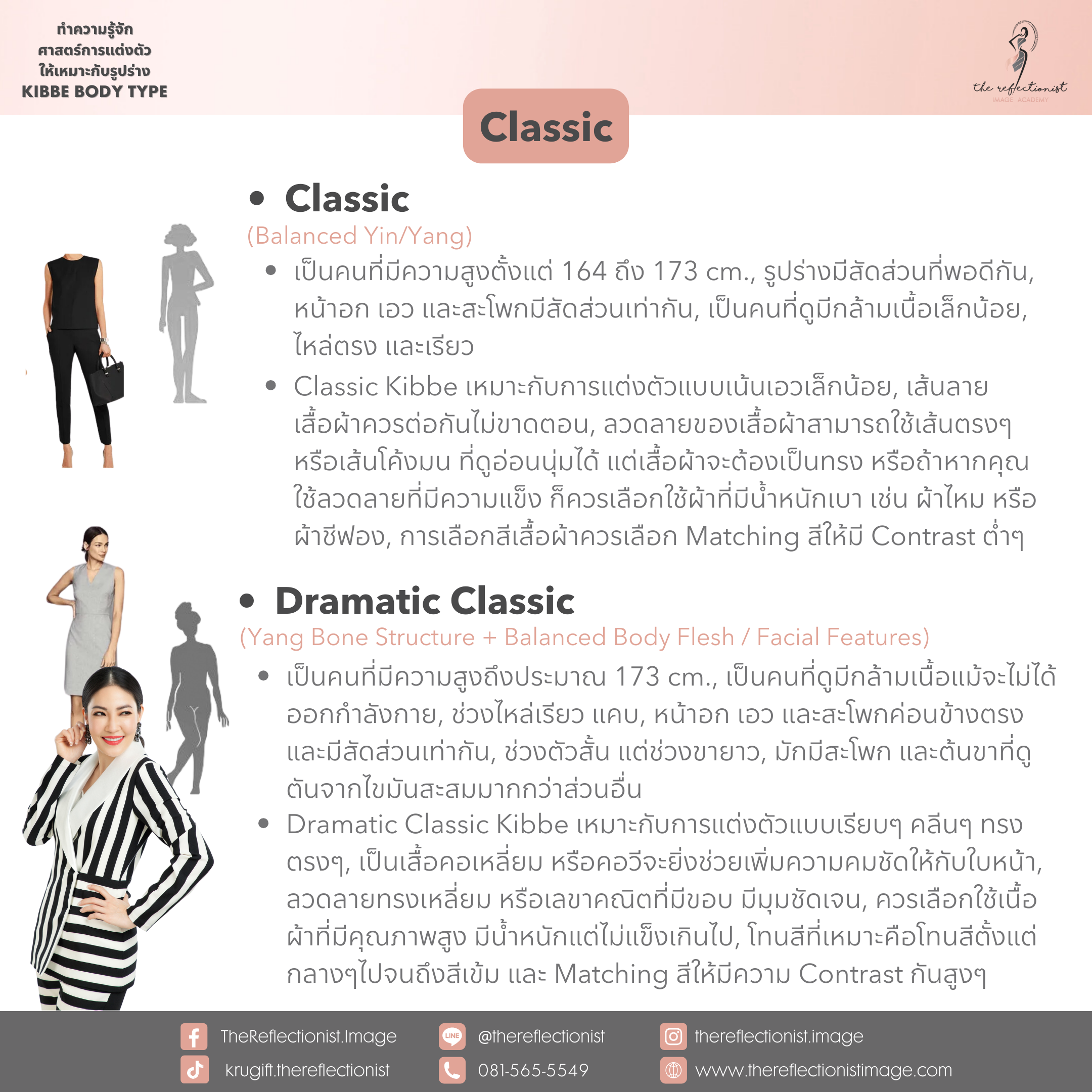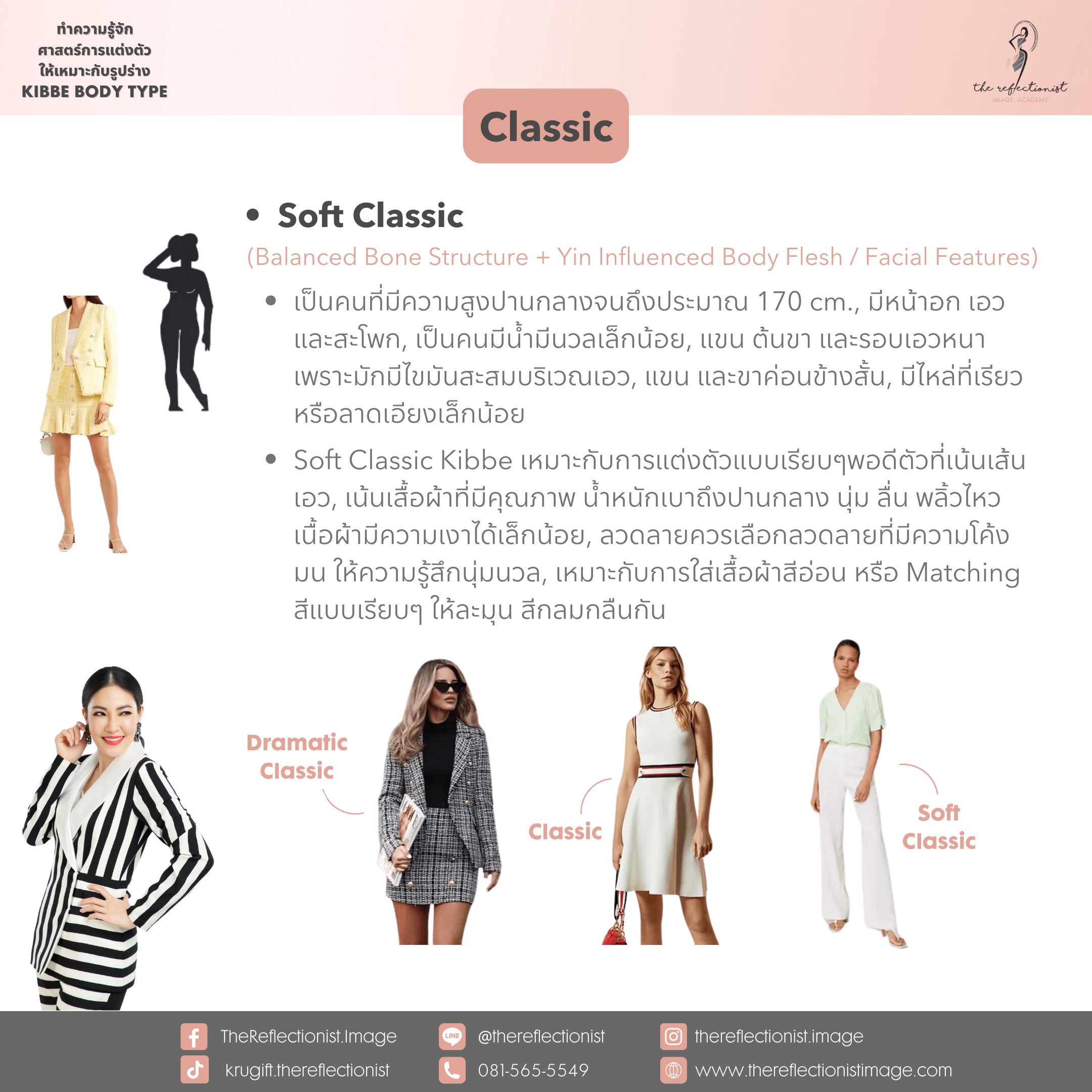 หลังจากที่คุณได้รู้ผลลัพธ์ของคำตอบแล้วว่าตัวคุณนั้น เป็น Kibbe Body Types แบบไหน ก็สามารถอ่านรายละเอียดเกี่ยวกับลักษณะส่วนใหญ่ของรูปร่าง Type ที่คุณได้ และการแต่งตัวที่เหมาะกับคุณได้ดังรูปที่ครูกิ๊ฟได้ทำสรุปมาให้คุณได้อ่านในวันนี้ค่ะ