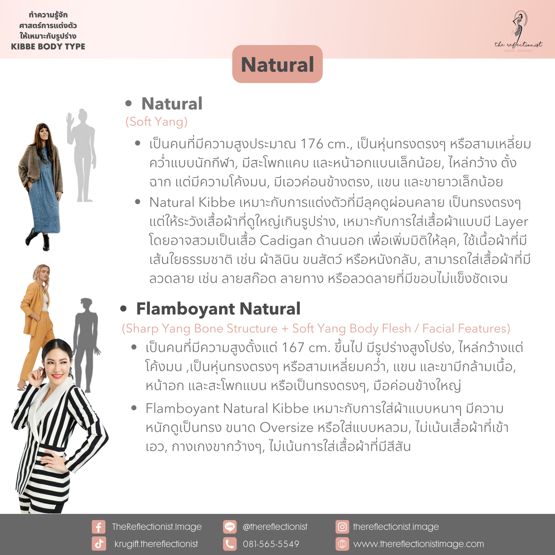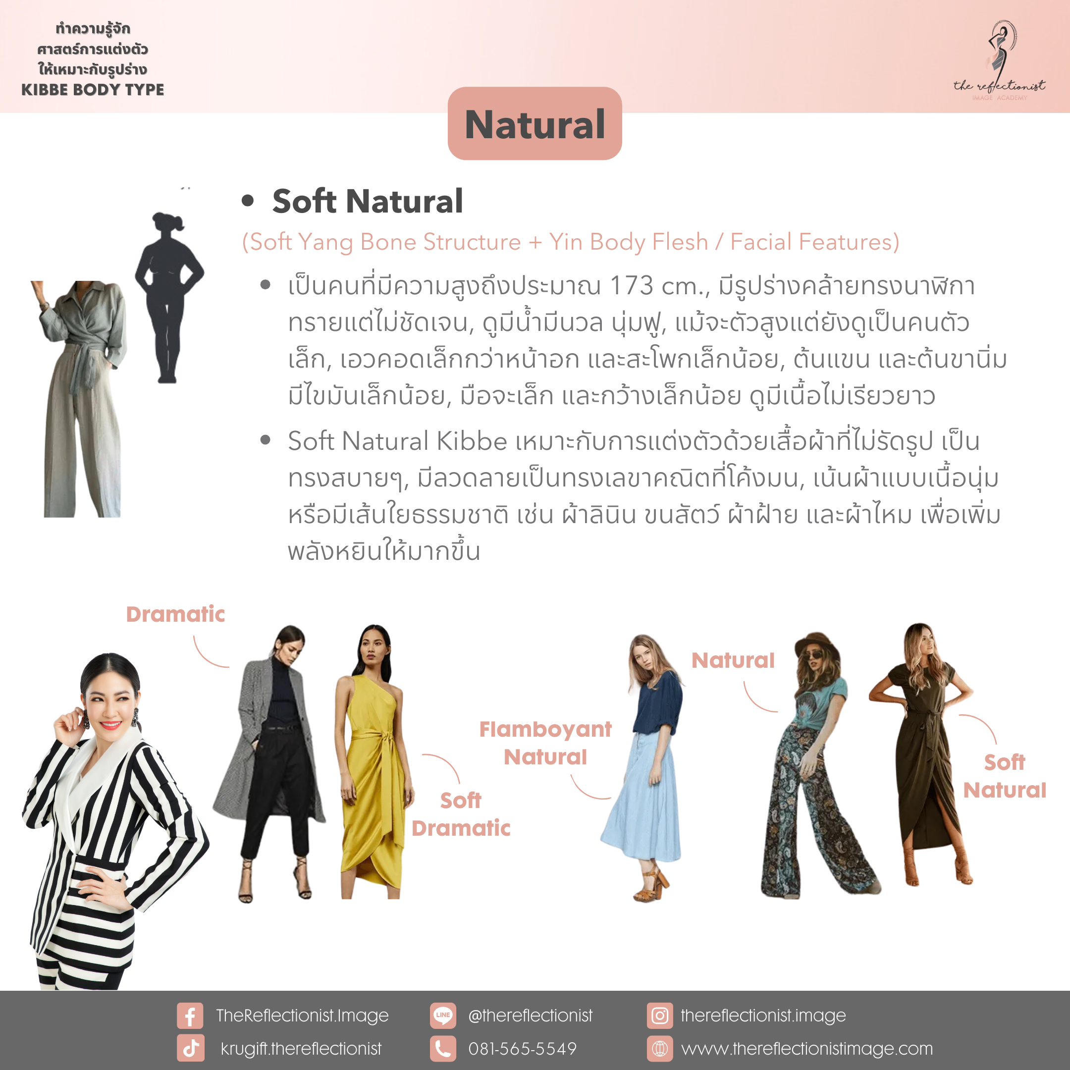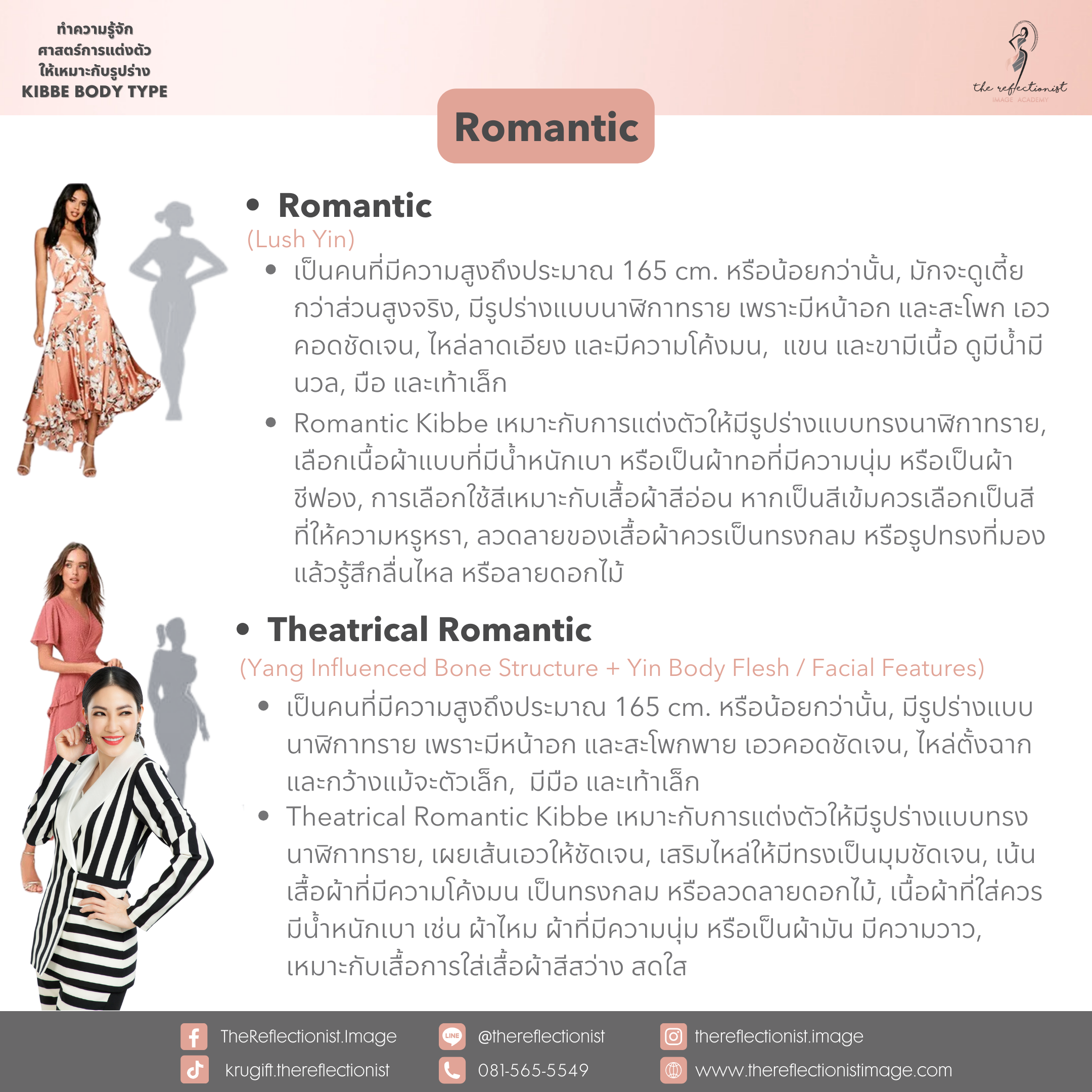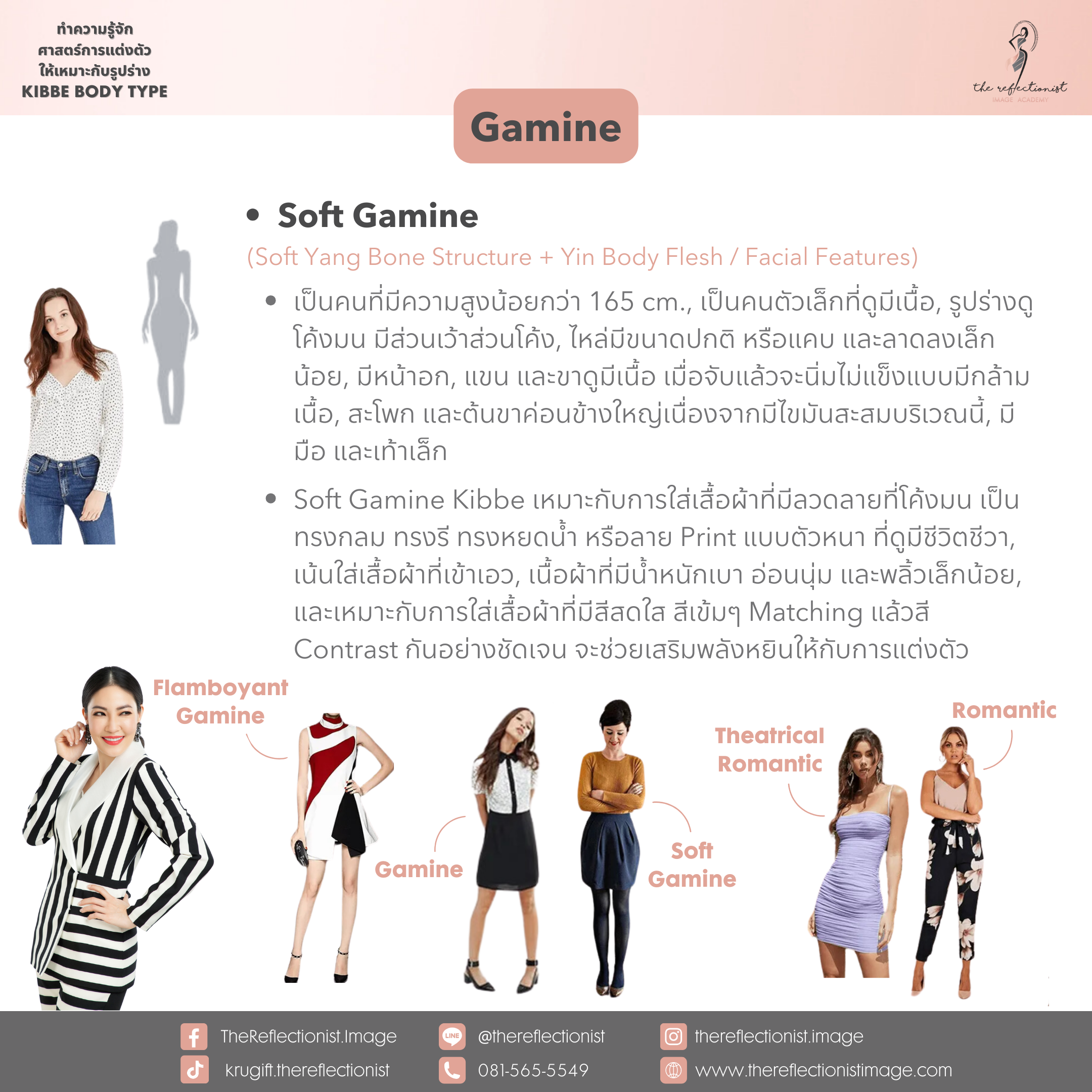 หลังจากที่คุณได้รู้ผลลัพธ์ของคำตอบแล้วว่าตัวคุณนั้น เป็น Kibbe Body Types แบบไหน ก็สามารถอ่านรายละเอียดเกี่ยวกับลักษณะส่วนใหญ่ของรูปร่าง Type ที่คุณได้ และการแต่งตัวที่เหมาะกับคุณได้ดังรูปที่ครูกิ๊ฟได้ทำสรุปมาให้คุณได้อ่านในวันนี้ค่ะ
