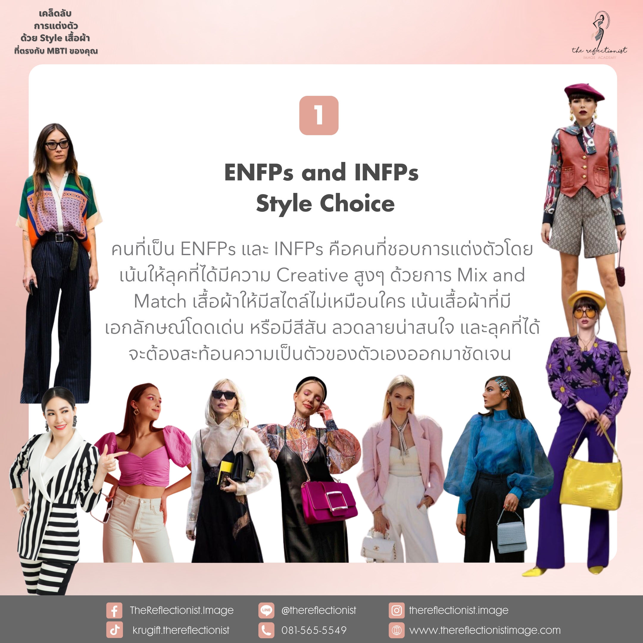 คนที่เป็น ENFPs และ INFPs คือคนที่ชอบการแต่งตัวโดยเน้นให้ลุคที่ได้มีความ Creative สูงๆ ด้วยการ Mix and Match เสื้อผ้าให้มีสไตล์ไม่เหมือนใคร เน้นเสื้อผ้าที่มีเอกลักษณ์โดดเด่น หรือมีสีสัน ลวดลายน่าสนใจ และลุคที่ได้จะต้องสะท้อนความเป็นตัวของตัวเองออกมาชัดเจน