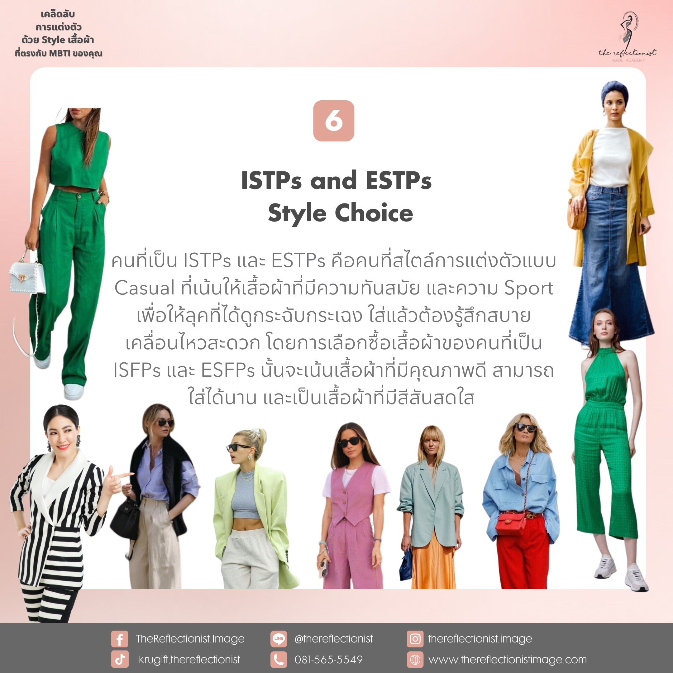 คนที่เป็น ISTPs และ ESTPs คือคนที่สไตล์การแต่งตัวแบบ Casual ที่เน้นให้เสื้อผ้าที่มีความทันสมัย และความ Sport เพื่อให้ลุคที่ได้ดูกระฉับกระเฉง ใส่แล้วต้องรู้สึกสบาย เคลื่อนไหวสะดวก โดยการเลือกซื้อเสื้อผ้าของคนที่เป็น ISFPs และ ESFPs นั้นจะเน้นเสื้อผ้าที่มีคุณภาพดี สามารถใส่ได้นาน และเป็นเสื้อผ้าที่มีสีสันสดใส